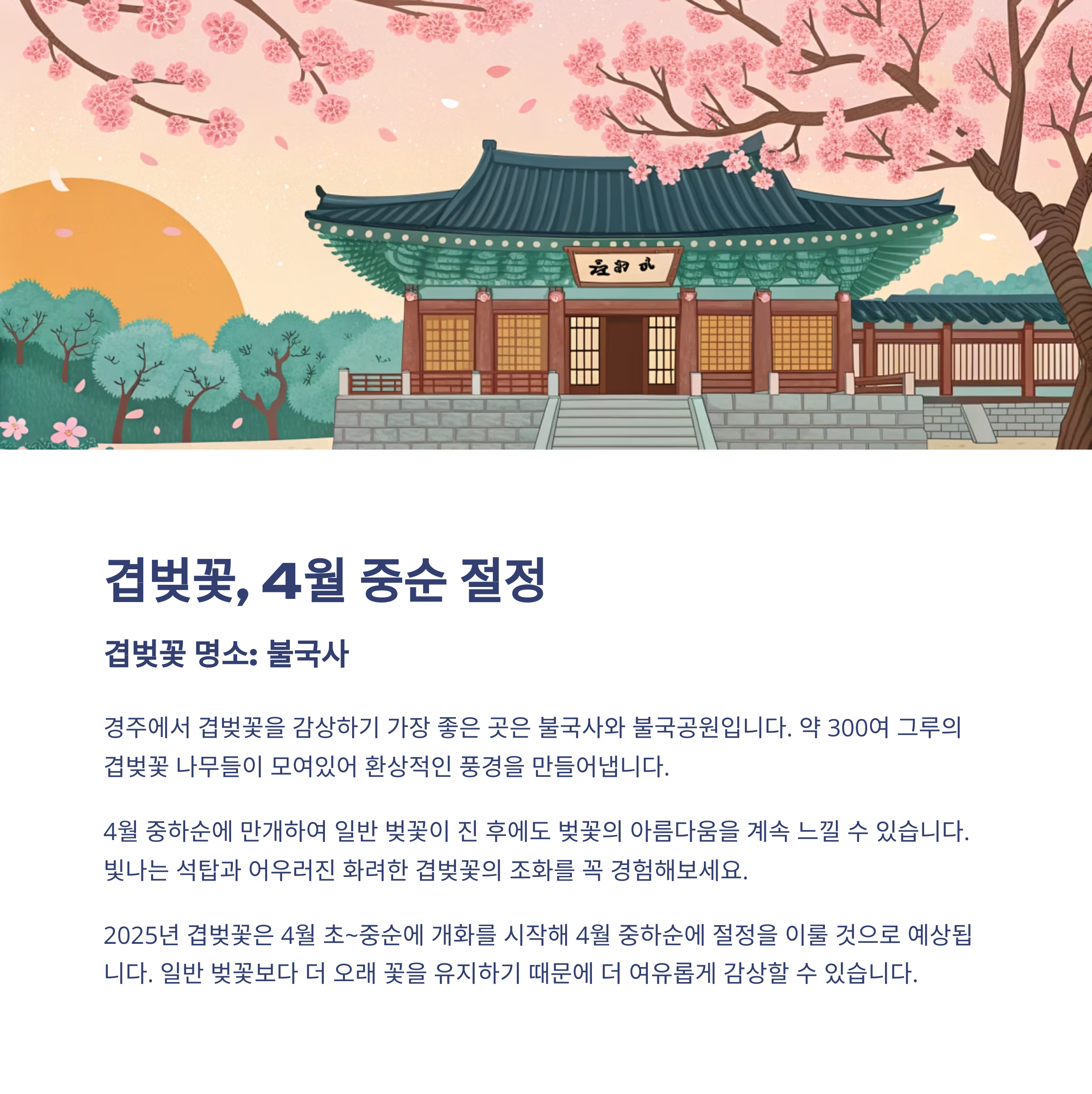 경주의 겹벚꽃 명소로는 불국사가 추천되며, 해당 지역은 겹벚꽃과 어우러진 경관이 사진에 담기에 딱입니다!