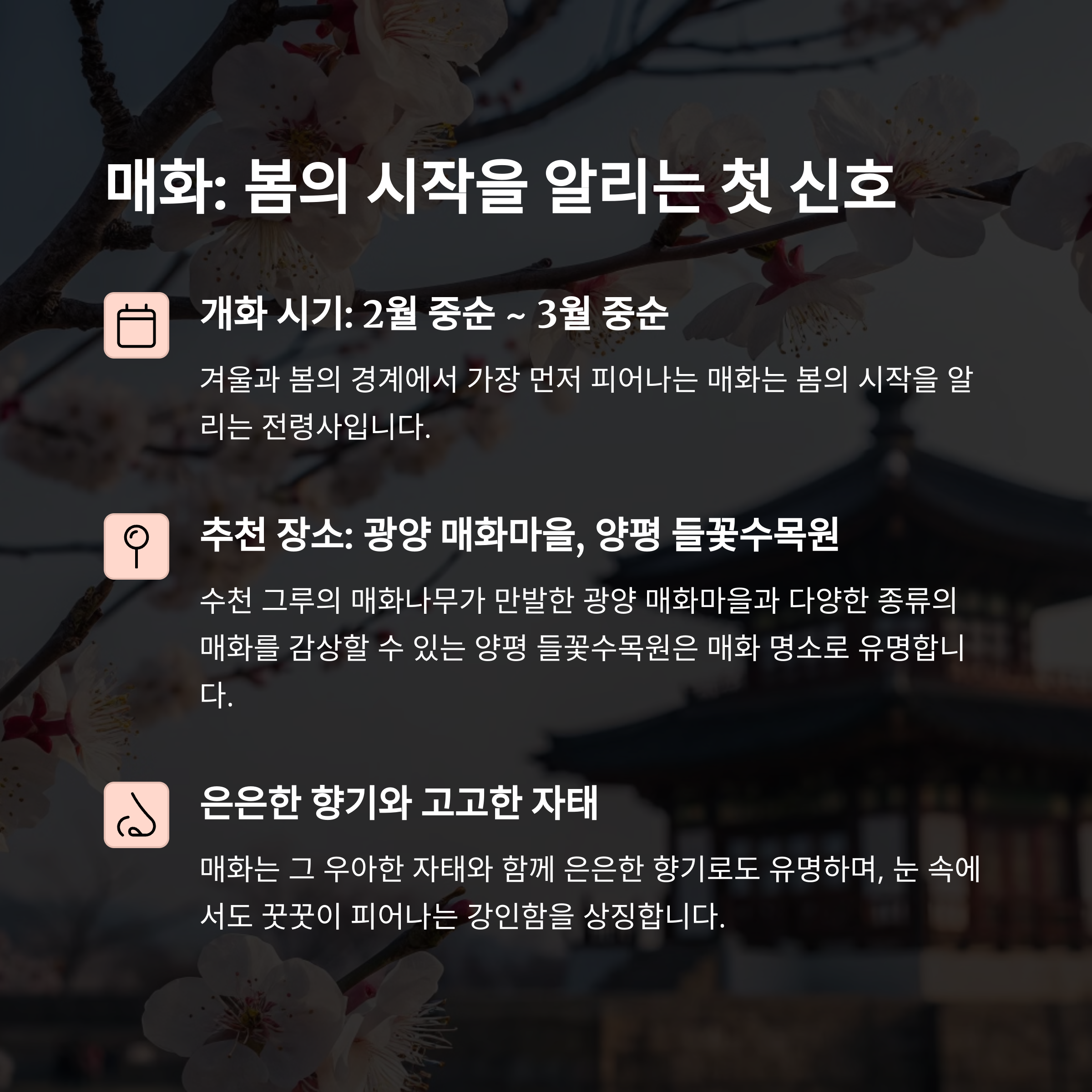 | 매화, 진달래, 유채꽃, 포시시아 | 2월 말 ~ 4월 말까지 다양 | 창덕궁, 전주 아보루테움, 서울숲 |