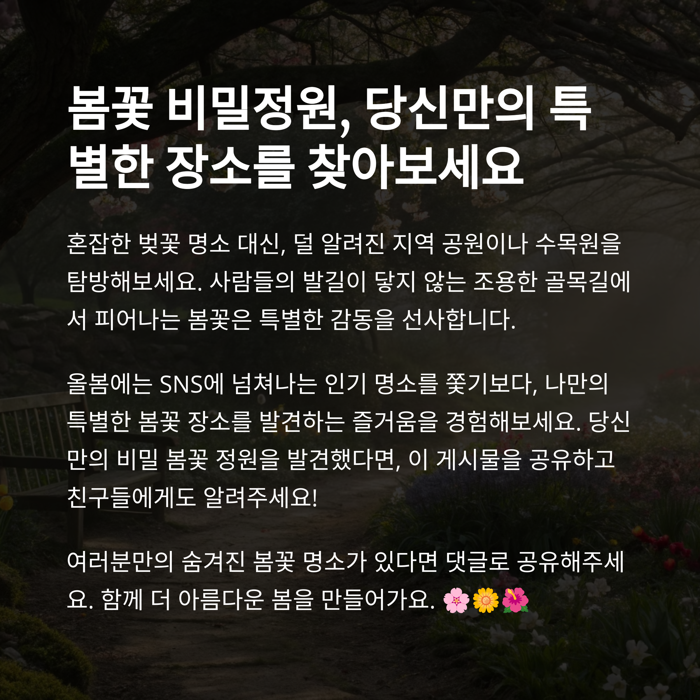 여러분은 어떤 봄꽃을 가장 좋아하시나요? 또는 조용히 자연을 즐길 수 있는 비밀정원을 알고 계신가요? 댓글로 여러분만의 봄 여행 이야기를 공유해주세요.