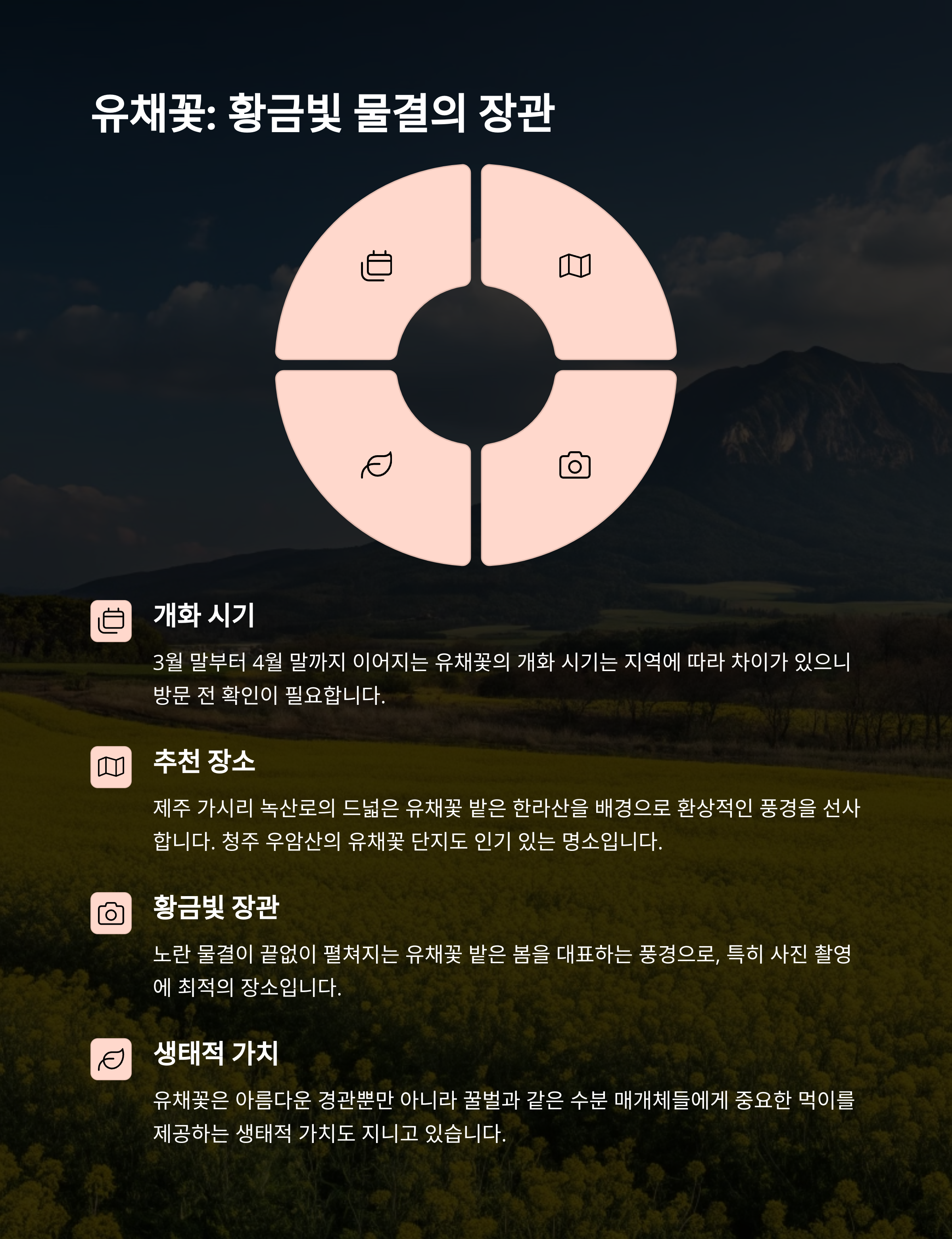| 제주도 봄꽃 미리보기 – 유채꽃밭과 벚꽃터널 베스트 코스 (3) | 2025.03.20 |