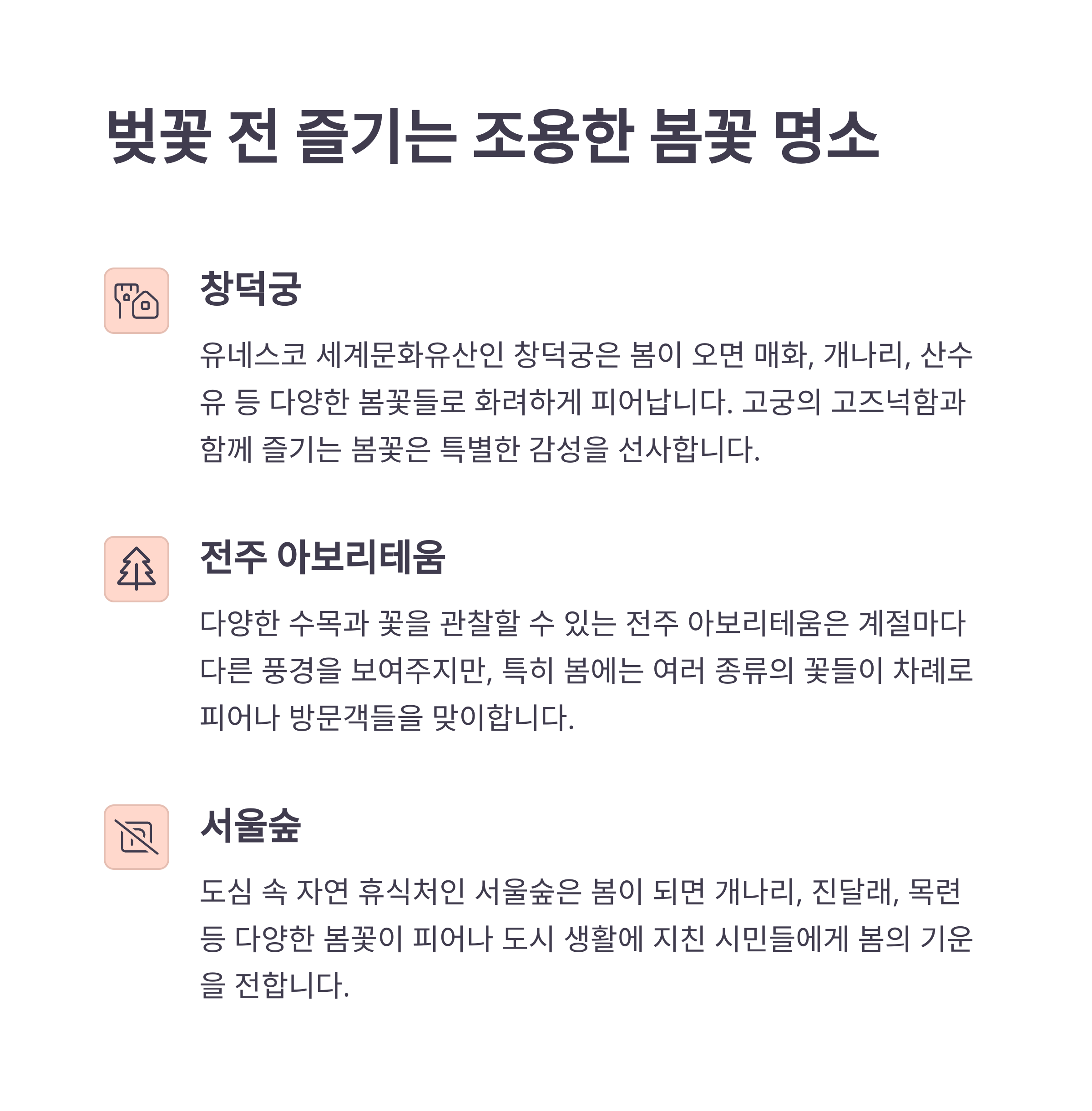 | 봄꽃 비밀정원 | 창덕궁, 전주 아보루테움, 서울 숲 등 조용한 명소 |