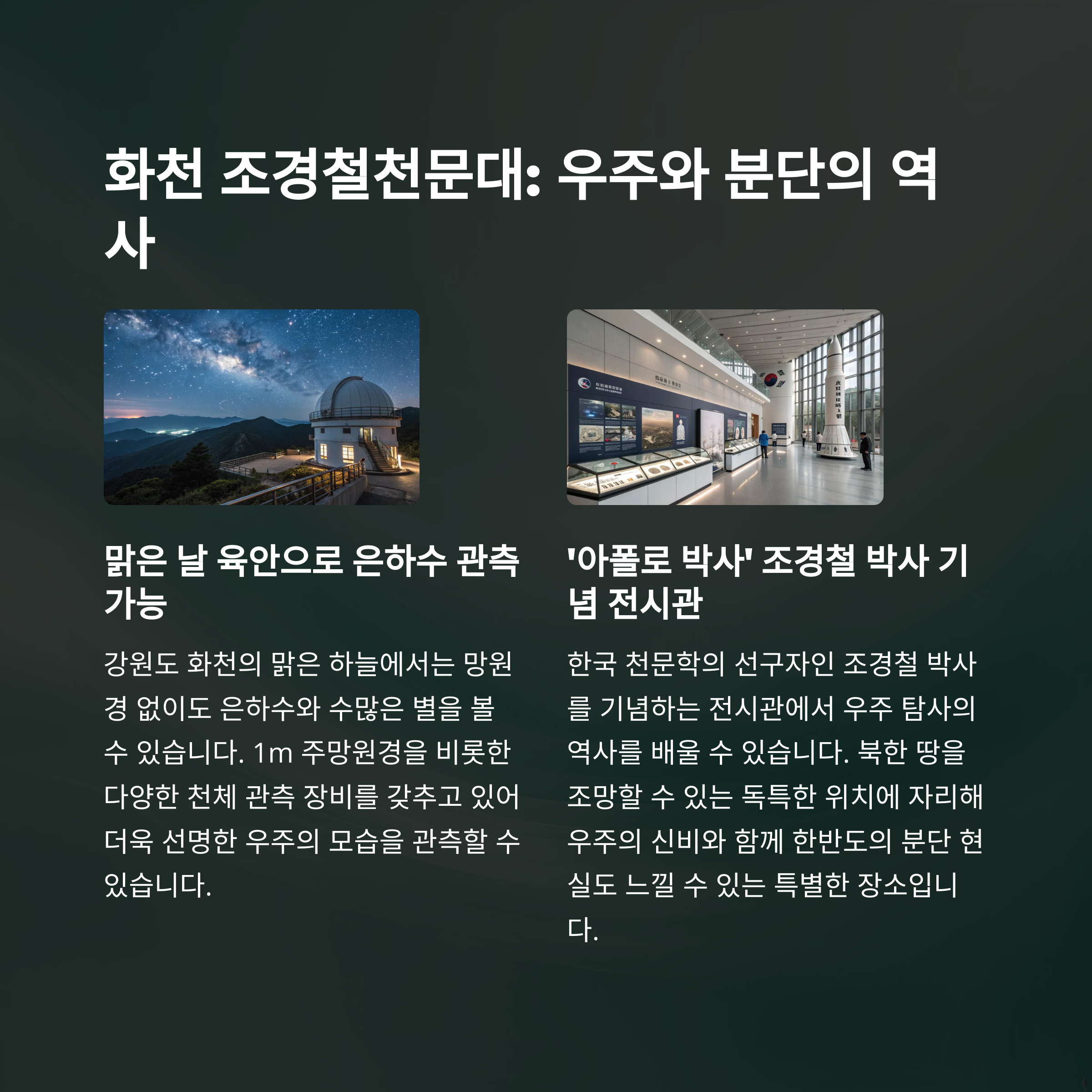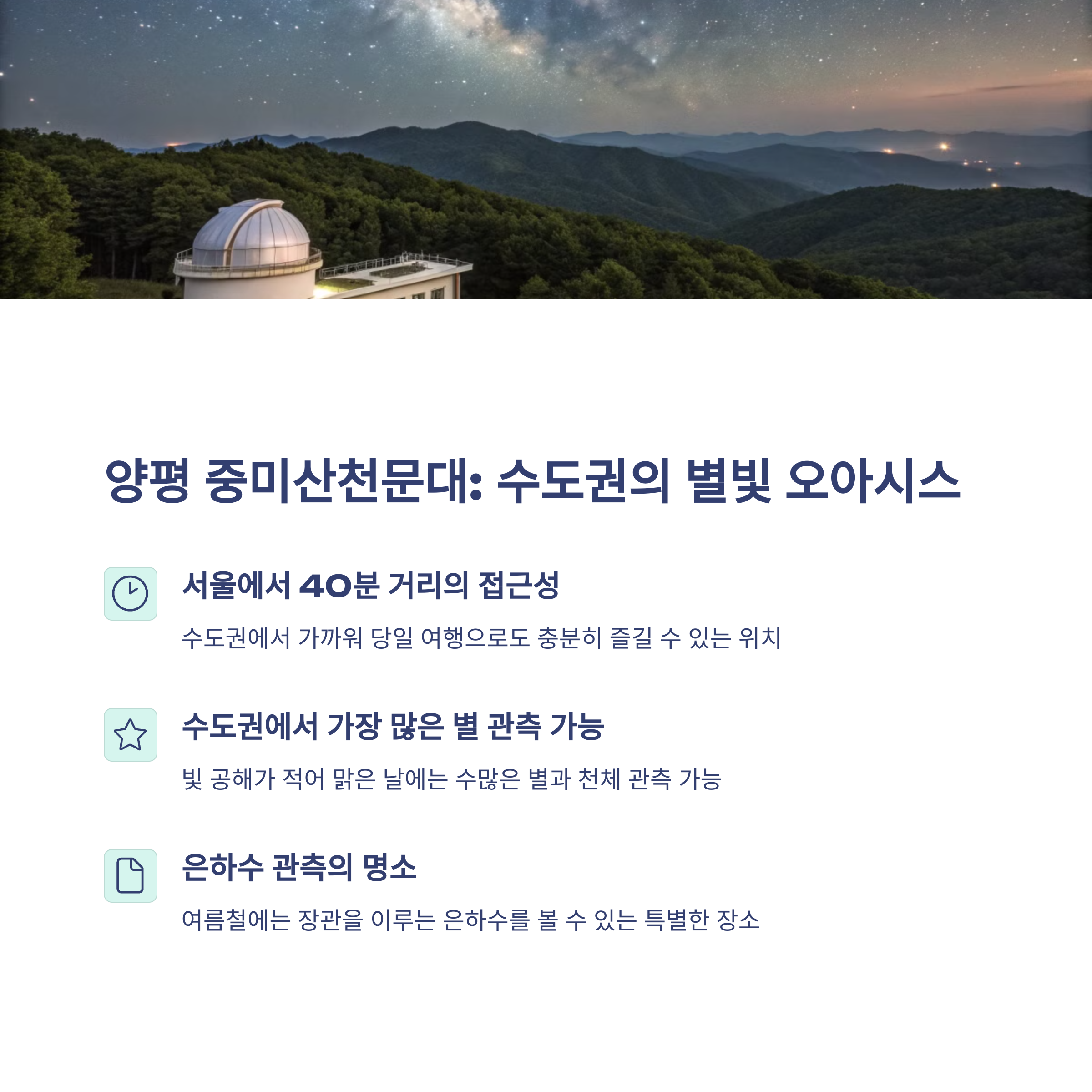 서울 근교에서 접근성이 좋은 양평 중미산 천문대와 강원도 고지대에 위치한 조경철 천문대도 추천할 만한 곳입니다. 중미산은 별자리 관찰이 쉽고 교육 체험 프로그램이 잘 구성되어 있으며, 조경철 천문대는 북한까지 조망 가능한 고지대의 이점을 살려 선명한 은하수와 함께 독특한 관측 환경을 제공합니다.