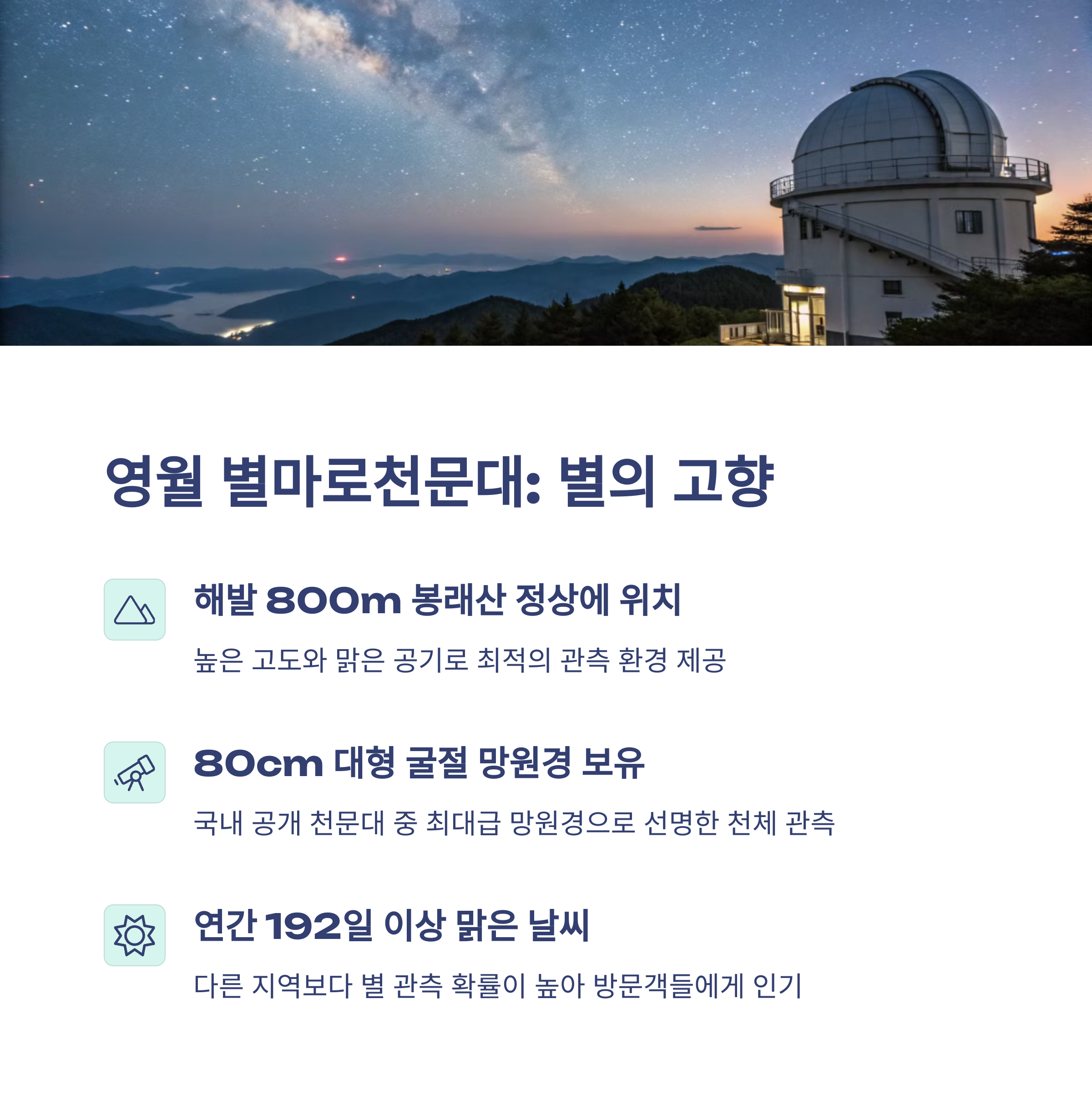대표적인 곳으로는 영월 별마로 천문대가 있습니다. 해발 800m에 위치하며, 80cm 굴절 망원경을 갖춘 국내 최대 규모의 천문대입니다. 여름철 은하수 시즌에는 심야 관측 프로그램과 별빛 콘서트 등이 운영되어 천문 애호가들의 필수 방문지로 자리 잡았습니다. 또한 1년 중 192일 이상 청명한 날씨를 자랑해 별 관측에 매우 유리한 조건을 갖추고 있습니다.