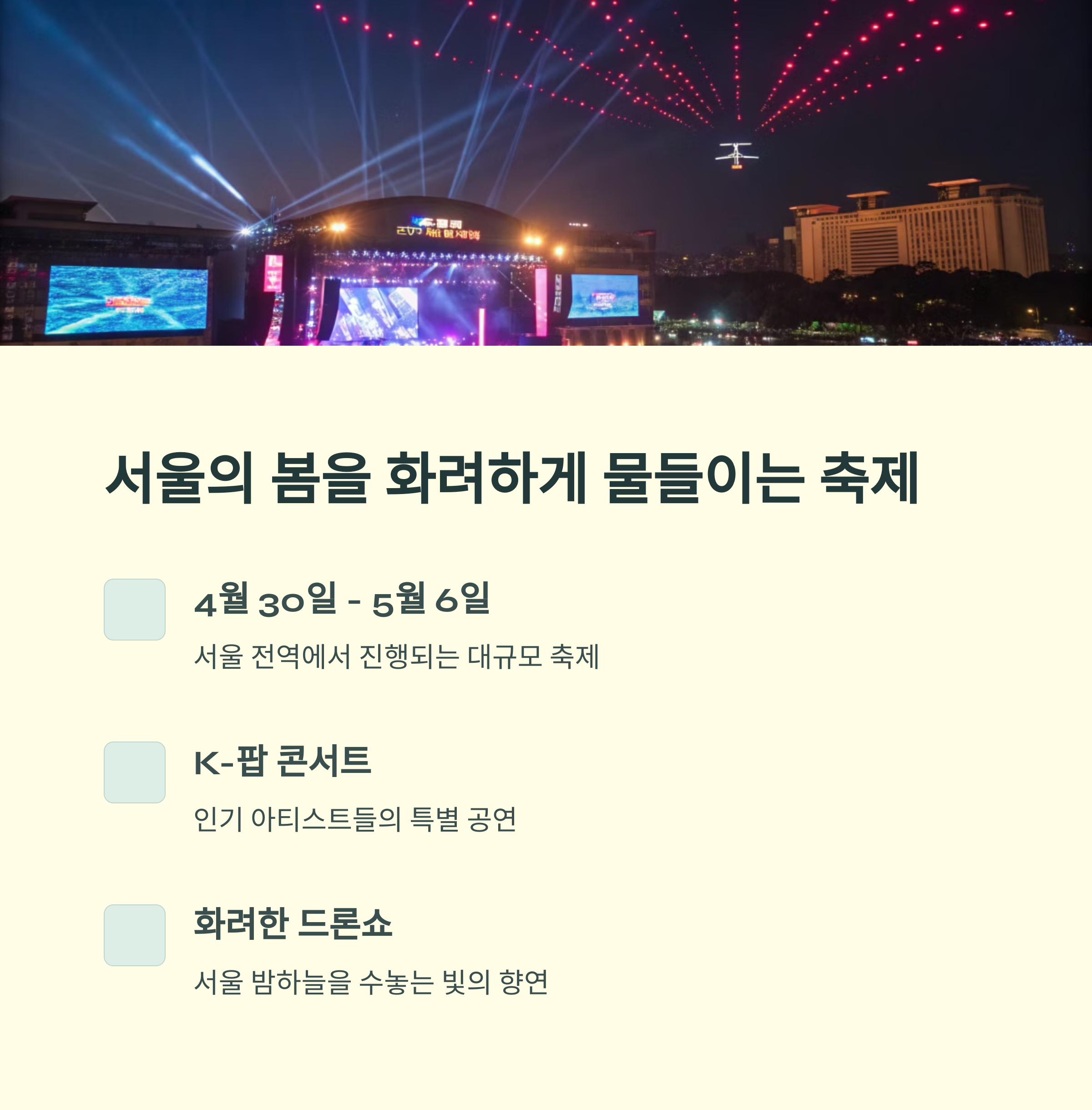 | 서울스프링페스타 | 4월 30일 - 5월 6일 | K-팝, 문화행사, 드론쇼 |