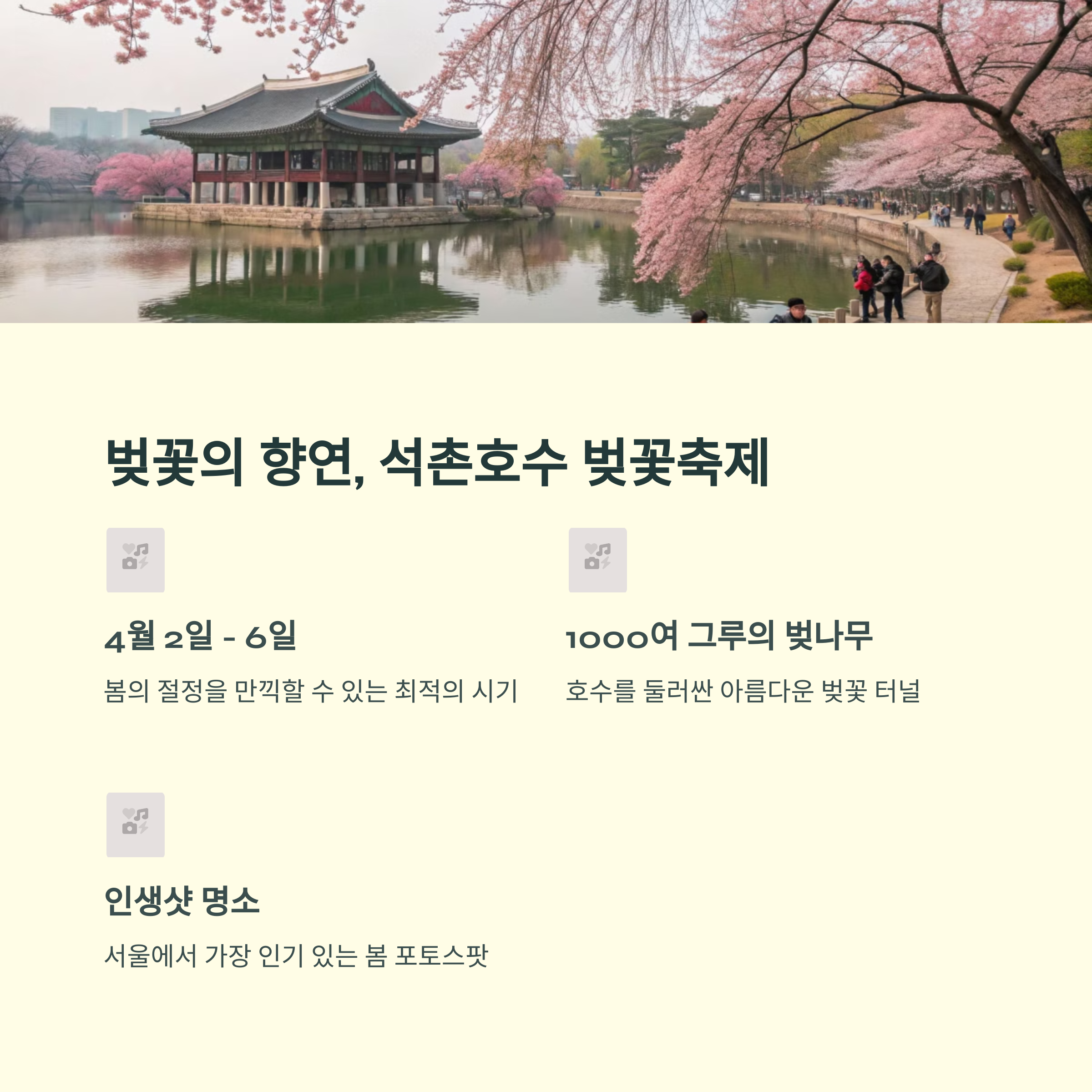 | 석촌호수/여의도/태안/부산 | 4월 전반 ~ 5월 초 | 벚꽃, 튤립, 연등, 지역축제 |