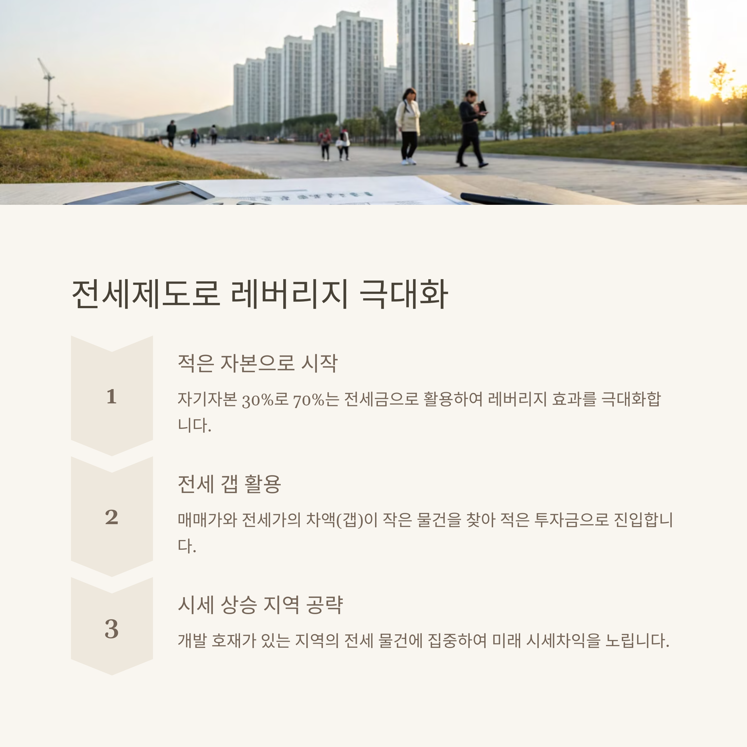 한국의 전세제도는 세계적으로도 독특한 구조를 가지고 있으며, 이를 잘 활용하면 실투자금 없이도 부동산 투자가 가능해집니다. 전세를 활용한 투자 방식은 매수자 입장에서 보증금을 활용해 자산을 확보하면서도 현금 흐름을 안정화할 수 있는 전략입니다. 특히 시세차익이 발생하는 시점에 맞춰 적절히 매도하면 최소한의 자금으로 최대의 수익을 기대할 수 있습니다. 요즘처럼 금리가 높고 대출 규제가 강한 시기에도 전세제도는 훌륭한 대안으로 부상하고 있습니다.