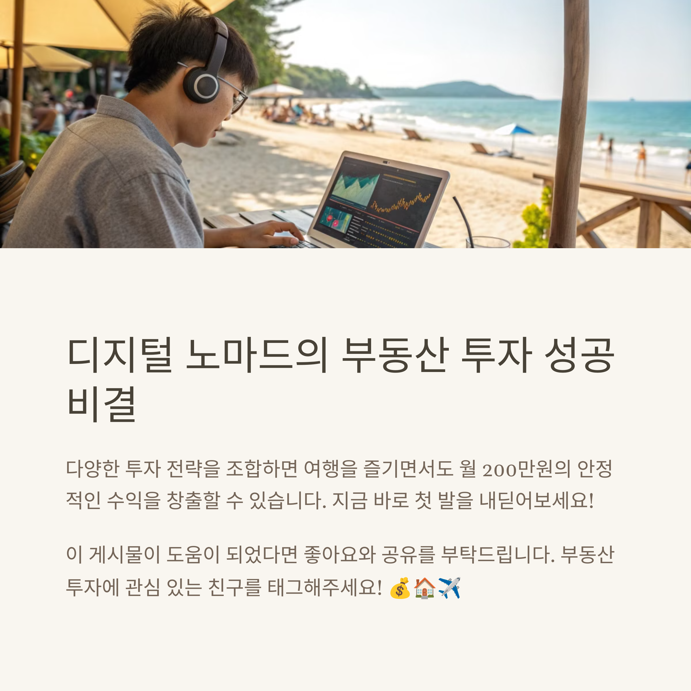 많은 분들이 경제적 자유를 꿈꾸며 다양한 재테크 방법을 찾고 계십니다. 그중에서도 부동산 투자는 여전히 많은 사람들에게 가장 매력적인 방법으로 손꼽힙니다. 하지만 대부분의 사람들은 막연한 두려움과 정보 부족으로 시작을 망설이곤 하죠. 오늘은 여행을 즐기면서도 매달 200만원의 수익을 얻을 수 있는 현실적인 부동산 투자 전략에 대해 이야기해보려 합니다. 시세차익 중심의 투자가 왜 지금 이 시대에 중요한지, 전세제도를 활용한 스마트한 투자 방식은 무엇인지, 그리고 해외 부동산 투자와 에어비앤비를 통한 추가 수익 방법까지 친절하고 이해하기 쉽게 안내드리겠습니다. 투자에 대한 새로운 관점과 실제 적용 가능한 전략을 함께 알아보시고 자유로운 삶을 향한 첫걸음을 시작해보세요.