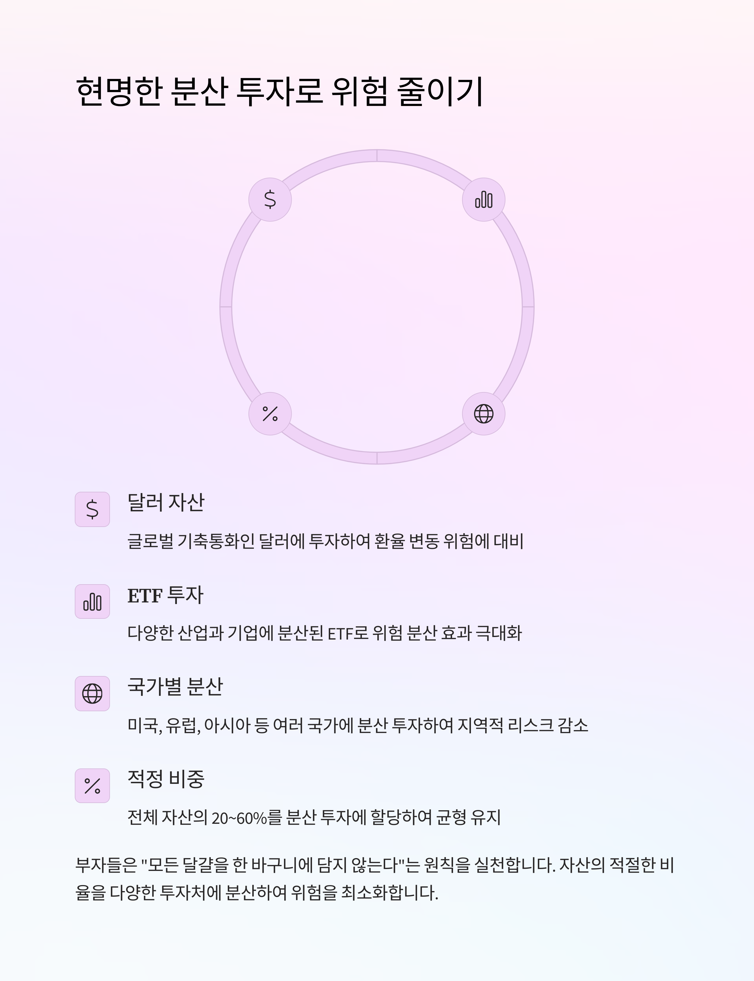 분산 투자는 투자 포트폴리오의 리스크를 줄이는 데 핵심적인 역할을 합니다. 시장 변동성으로 인한 손실을 줄이기 위해 다양한 자산에 분산 투자해야 합니다. 달러 상품, ETF, 주식, 채권 등 다양한 자산을 활용하면 안정성을 높일 수 있습니다. 분산 투자는 특정 자산의 성과가 부진하더라도 전체적인 투자 성과를 안정적으로 유지시켜줍니다. 높은 수익률과 제한된 리스크를 동시에 추구할 수 있는 가장 효과적인 전략입니다. |