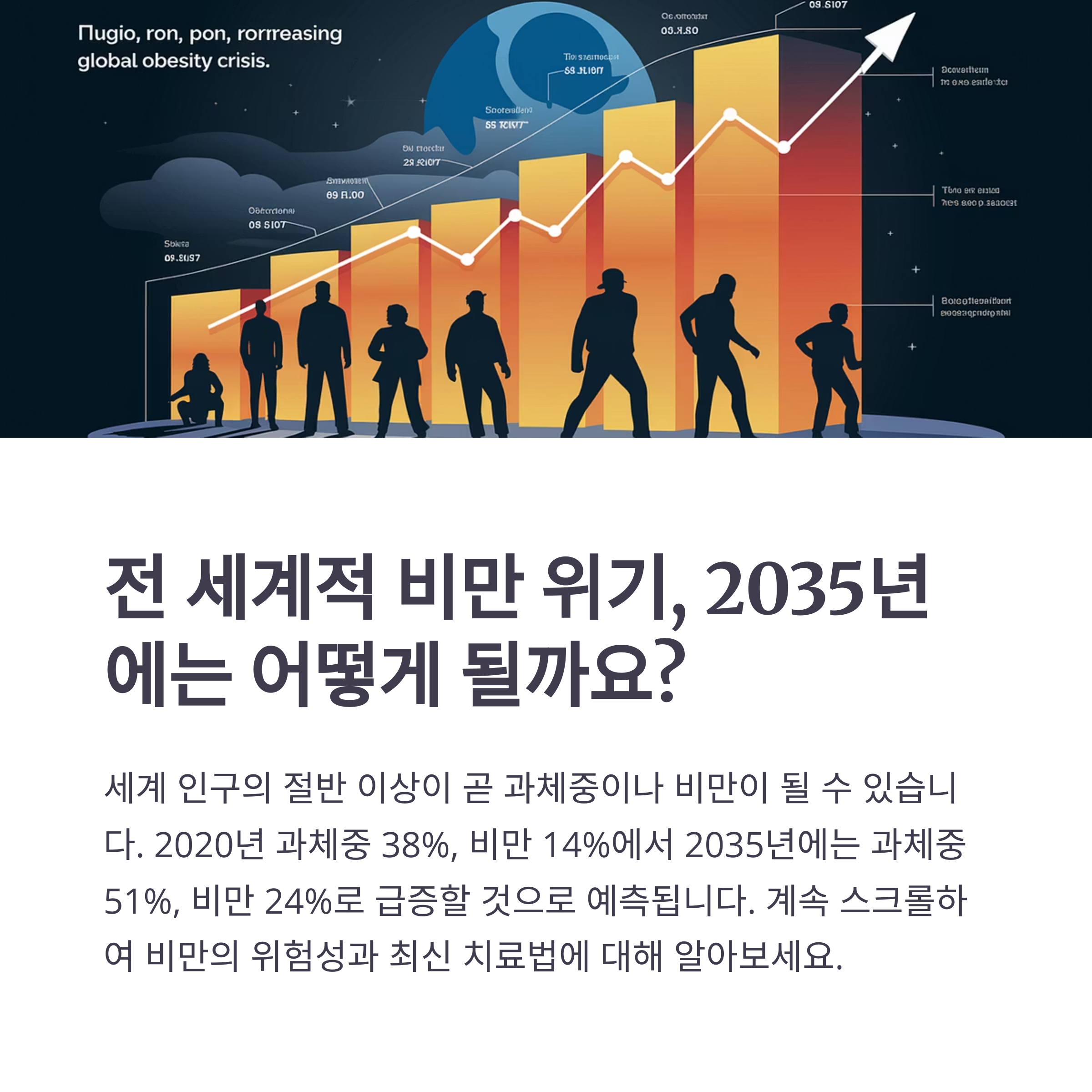 2020년 기준 전 세계 인구의 약 14%가 비만으로 분류되었지만, 이는 2035년 즈음에 24%로 증가할 것으로 예측됩니다.