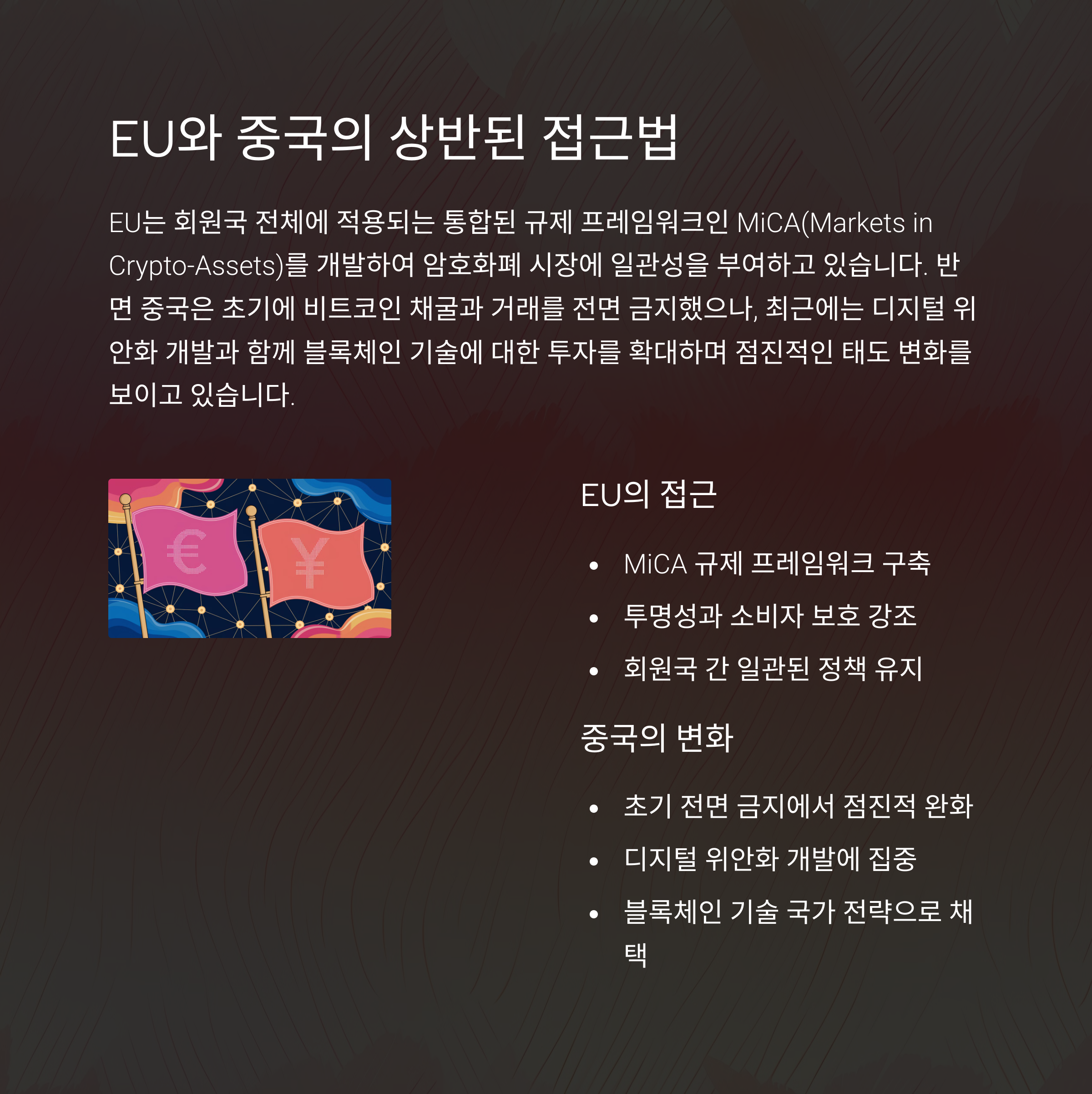 주요 국가 동향 | 미국, EU, 중국 등 각국의 암호화폐 규제 현황 소개 |