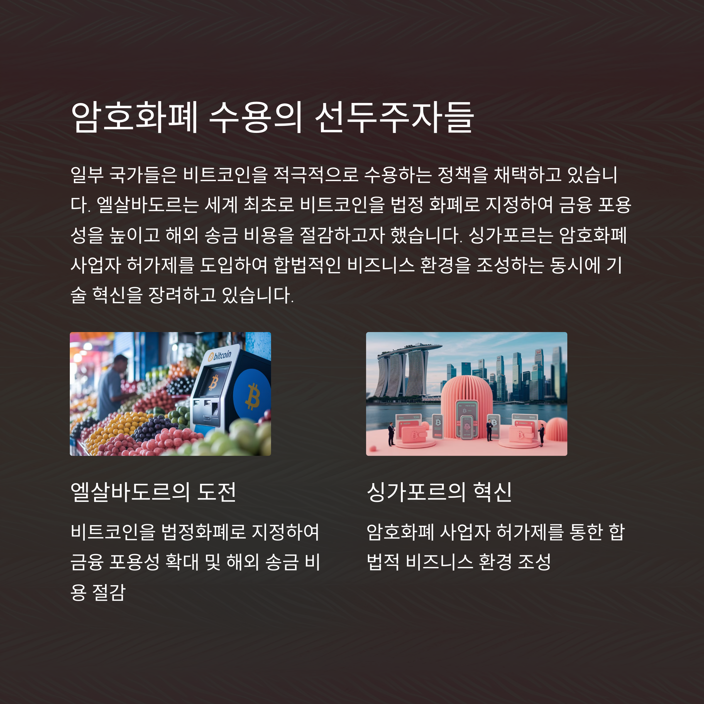 각국의 규제 방향은 국가의 경제 상황과 금융 인프라에 따라 차이를 보입니다. 미국은 암호화폐를 자산 유형에 따라 증권 혹은 파생상품으로 분류하여 규제하고 있으며, 유럽연합은 MiCAR을 통해 포괄적인 제도를 도입하여 암호화폐 시장을 통제하려 하고 있습니다. 중국은 강력한 규제로 거래와 채굴 자체를 금지했으며, 엘살바도르는 반대로 비트코인을 국가 공식 통화로 인정하는 전혀 다른 접근을 택했습니다. 싱가포르와 스위스는 명확하고 유연한 정책을 통해 암호화폐 산업을 적극적으로 육성하고 있습니다.