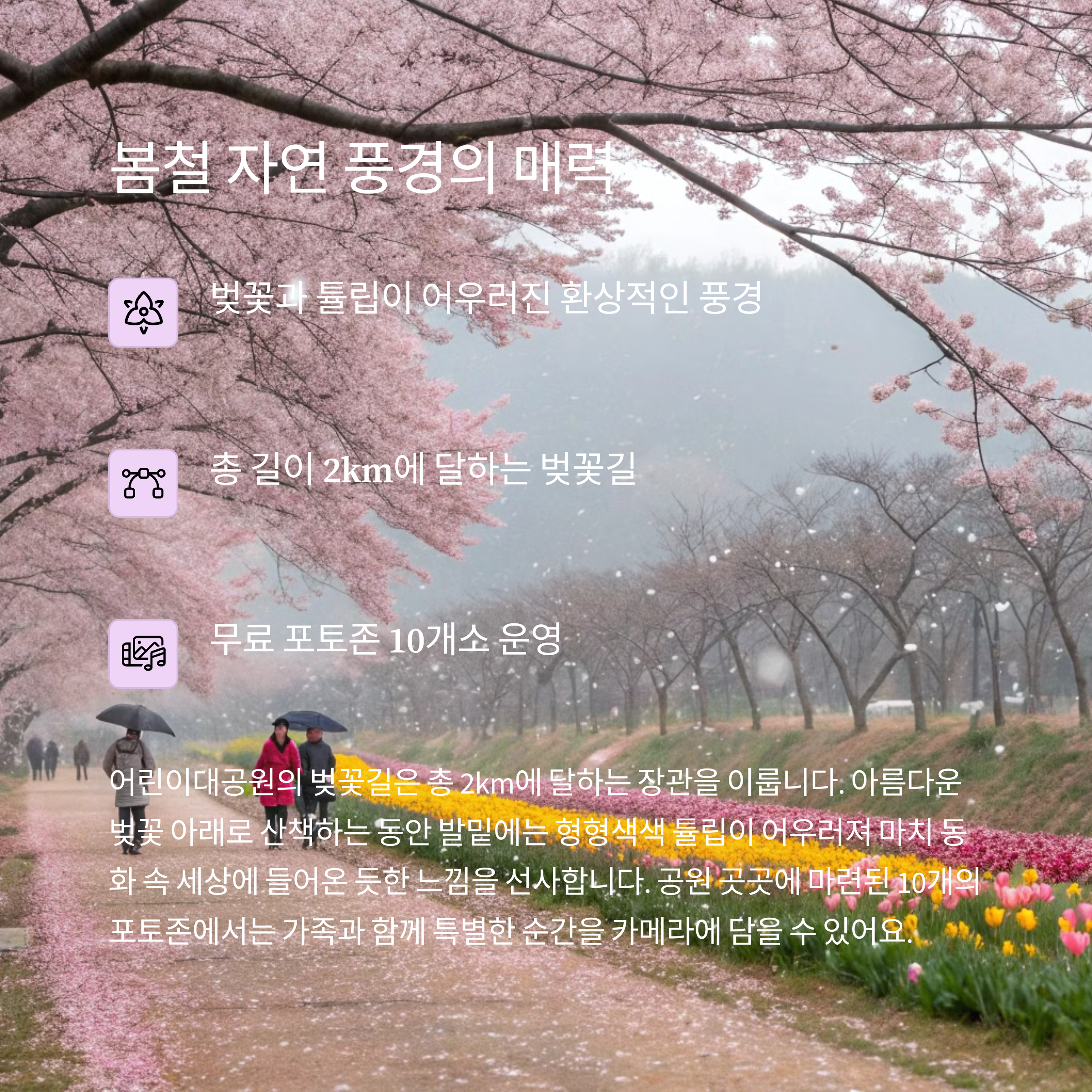 | 3월 말 ~ 4월 초, 벚꽃과 함께 만개 시기 | 튤립밭, 벚꽃터널, 중앙광장 포토존 | 동물 관찰, 식물 탐방, 만들기 체험 |