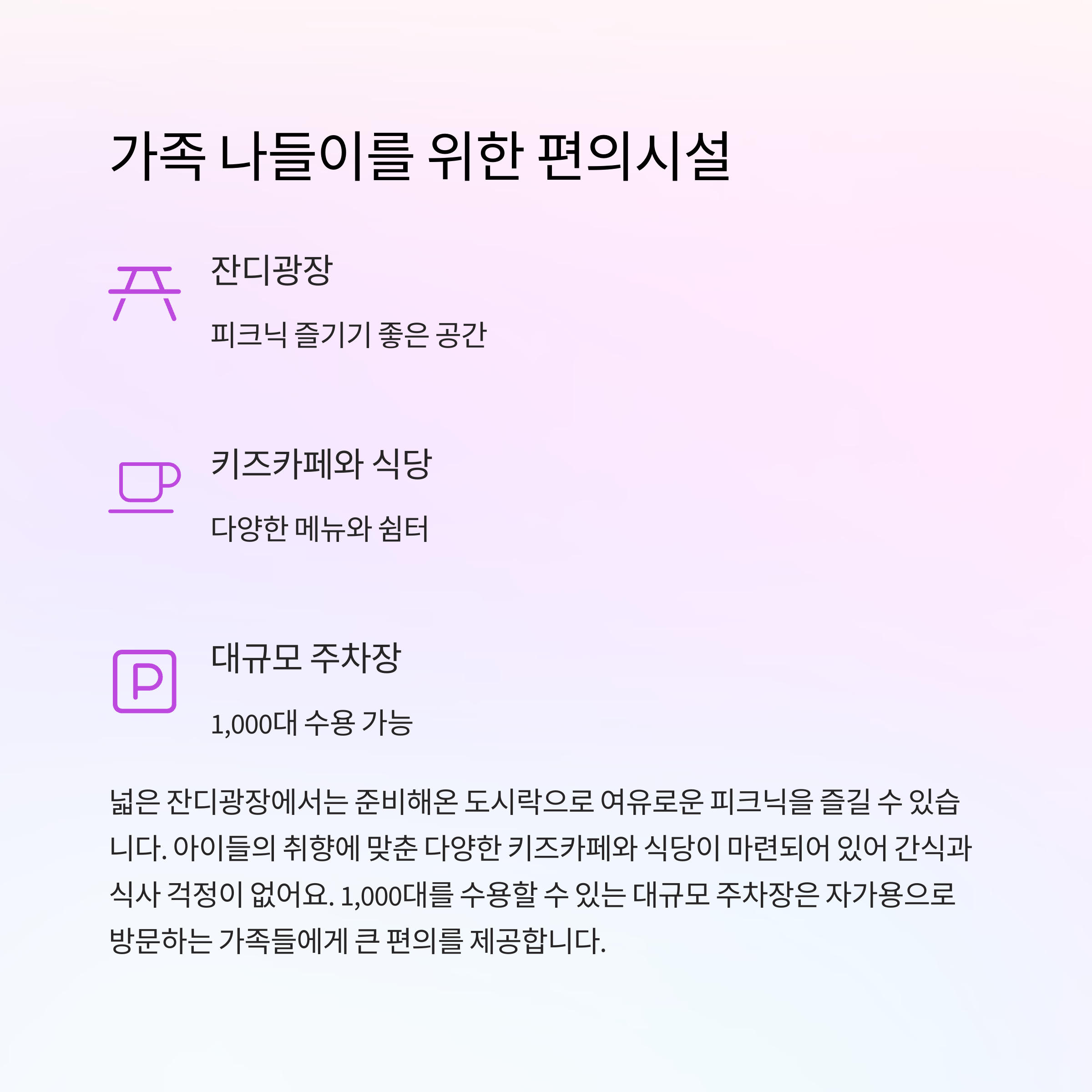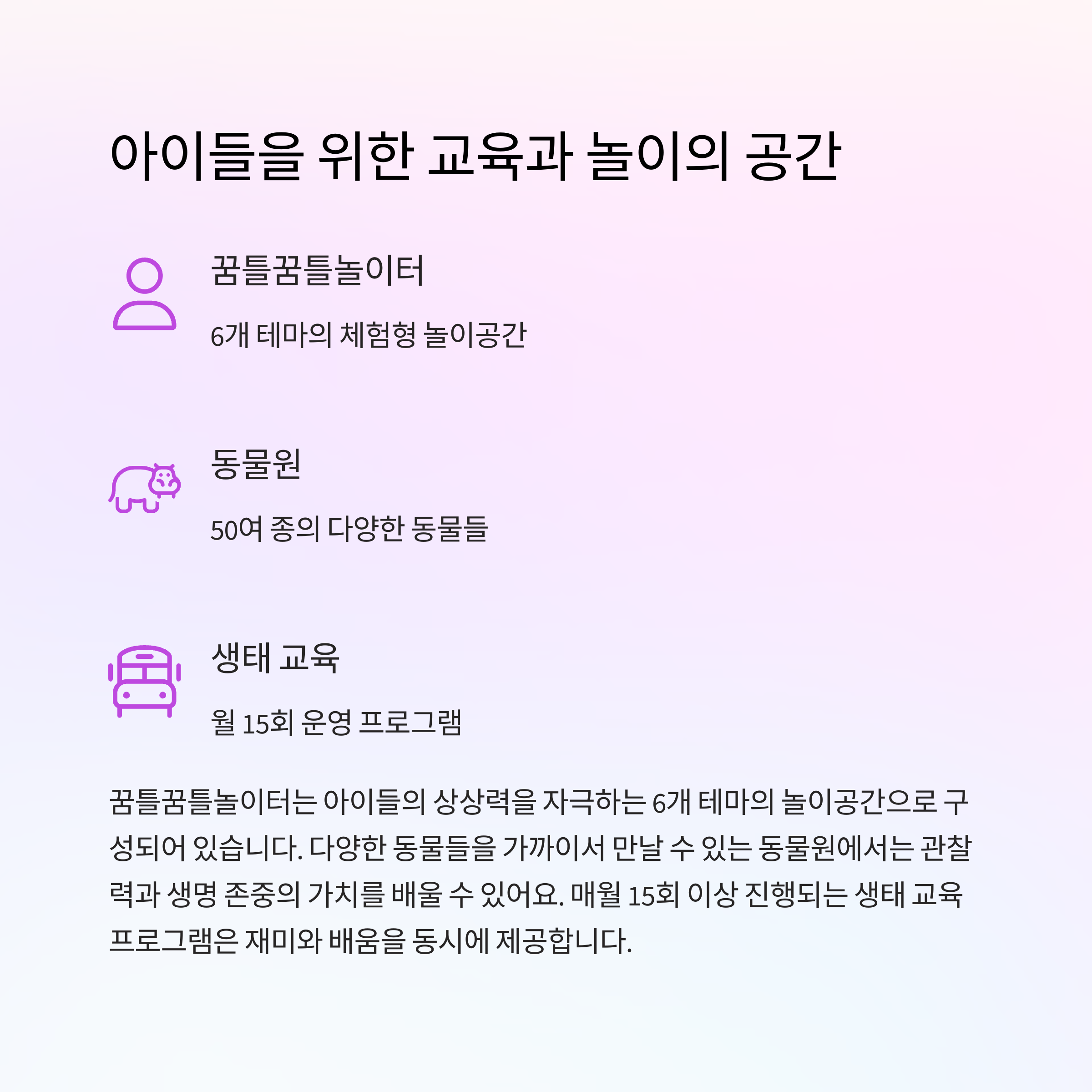 | 인기 체험 공간 | 꿈틀꿈틀놀이터, 식물원, 동물원, 포토존 등 |