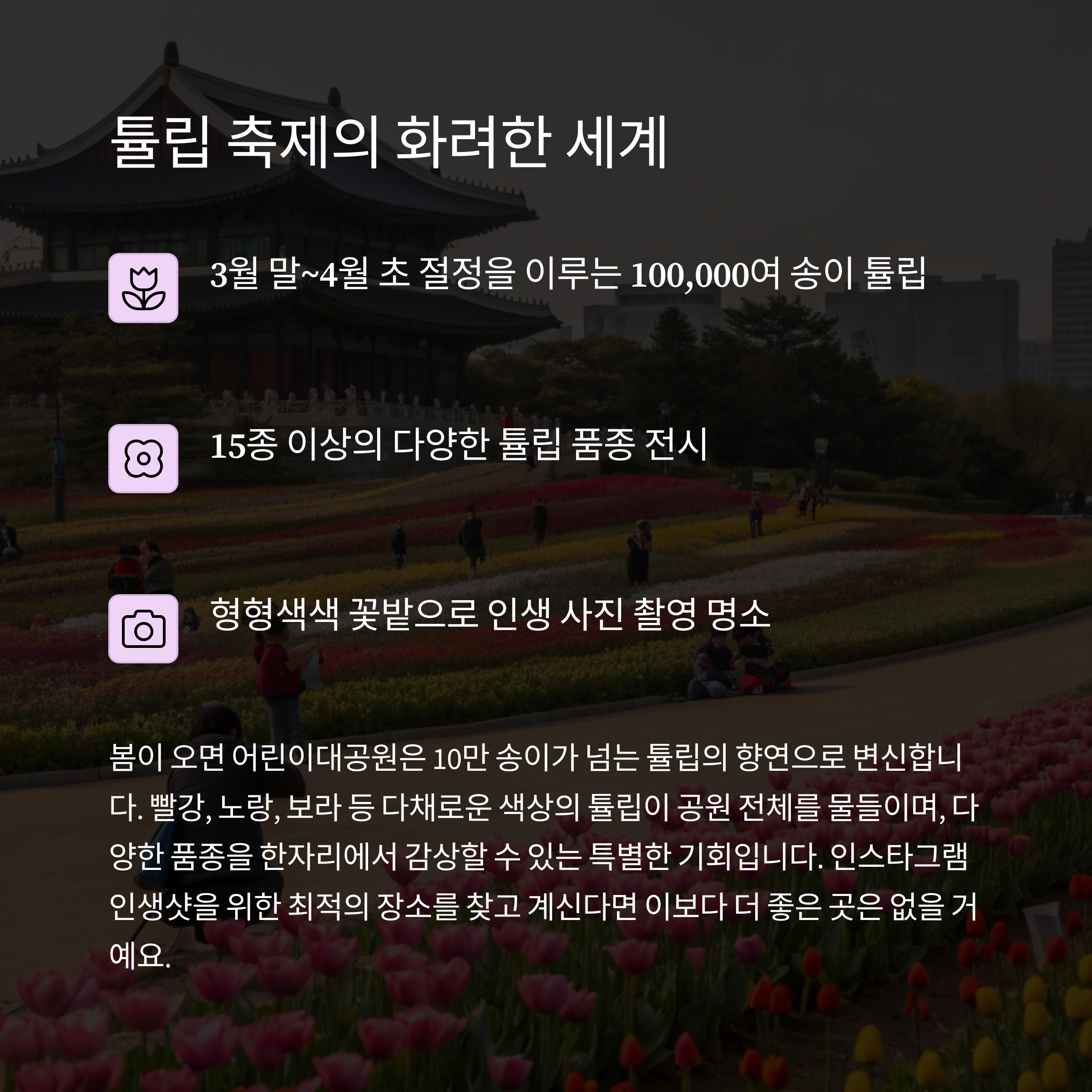 | 튤립축제 시기 | 3월 말 ~ 4월 초, 봄꽃이 만개하는 시기 |