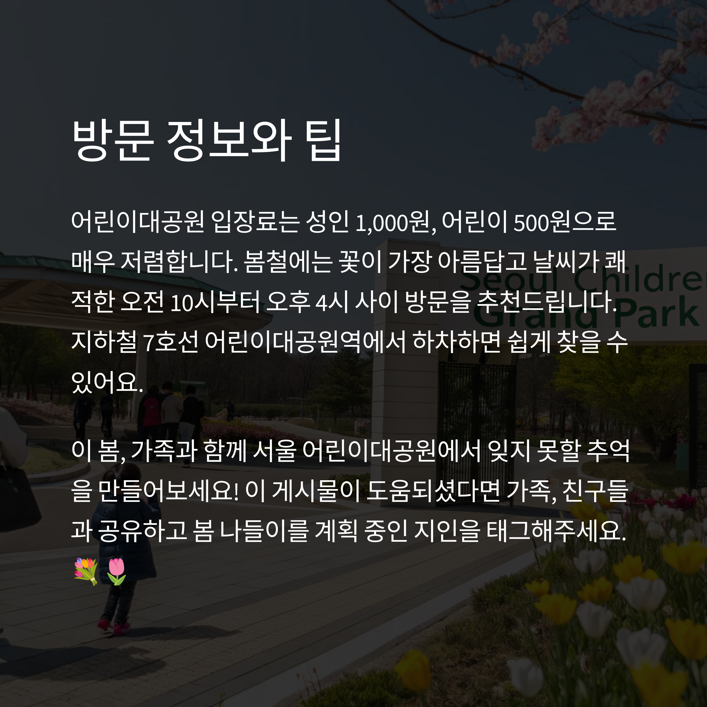 서울 어린이대공원 튤립축제는 도심 속에서 자연을 즐기며 아이와 특별한 추억을 만들 수 있는 최고의 장소입니다. 다양한 놀이시설과 체험 공간, 화사한 봄꽃은 단순한 나들이를 넘어서 가족의 소중한 시간을 만들어 줍니다. 봄날의 햇살 아래에서 튤립과 벚꽃 사이를 거닐며 찍는 사진 한 장이 아이에게는 오래도록 기억에 남을 추억이 될 것입니다. 이번 봄, 어린이대공원에서 아이와 함께하는 특별한 하루를 계획해보세요.