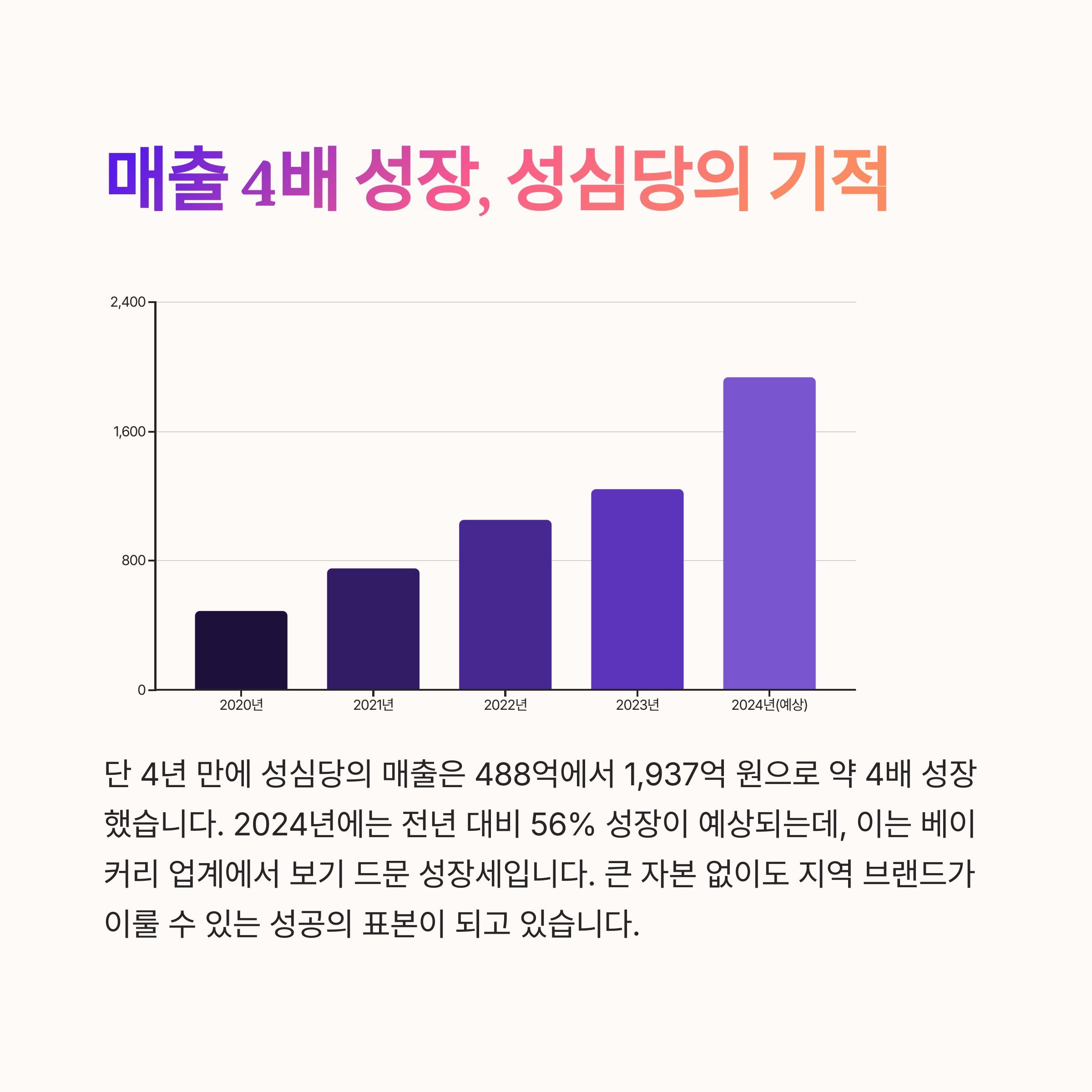 이는 전년도 대비 56% 증가로, 단일 브랜드로서 대형 프랜차이즈와 경쟁할 수 있을 정도의 성과입니다.