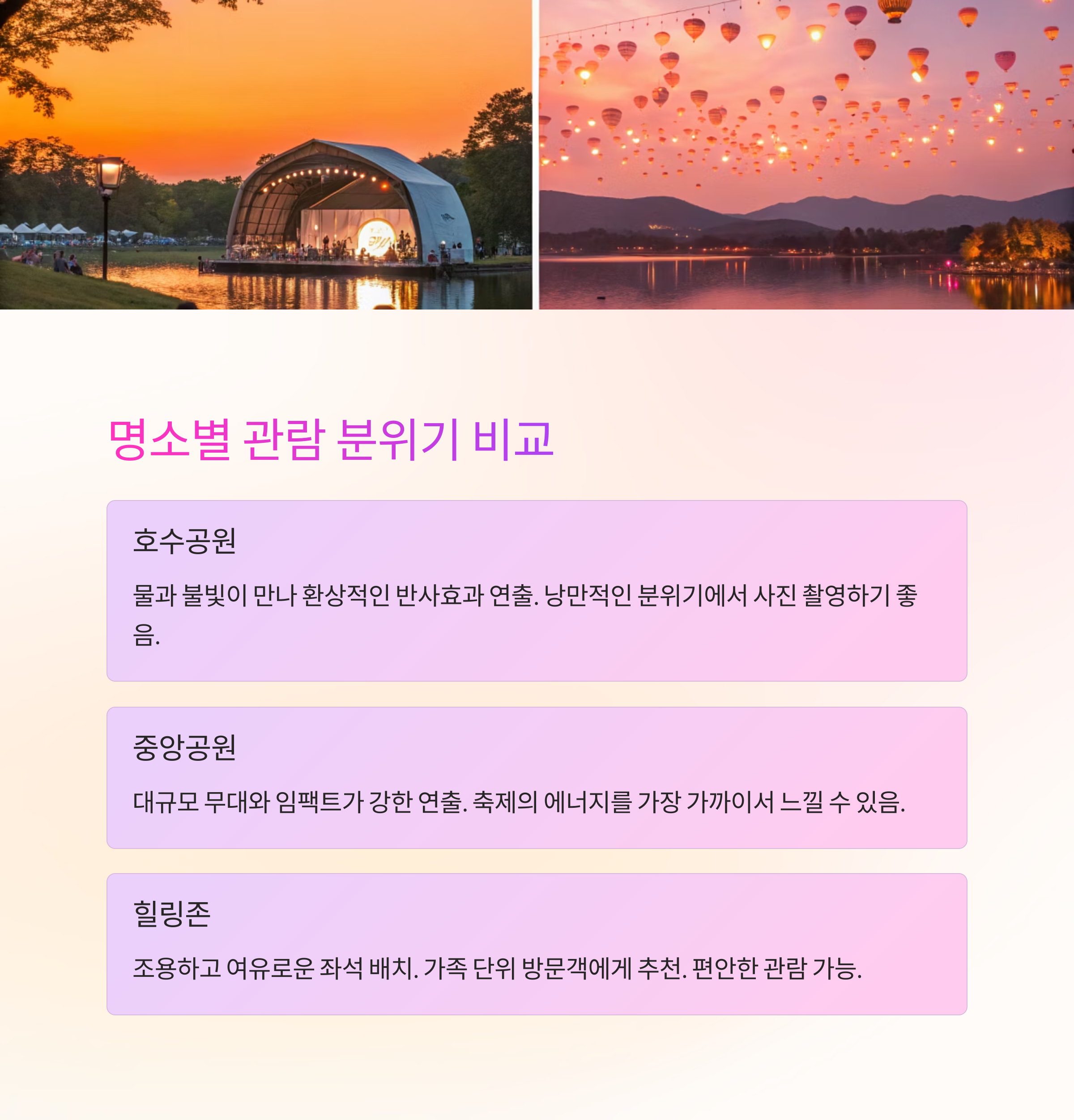 - 무대 주변 관람석: 공연과 불꽃을 동시에 감상 가능