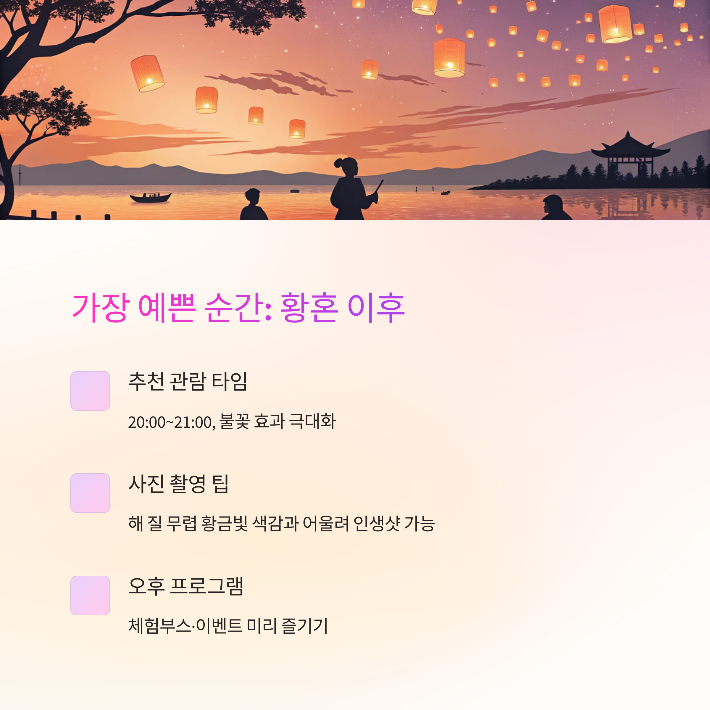 - 9시 이후: 사람들 빠지고 여운을 즐기기 좋은 시간