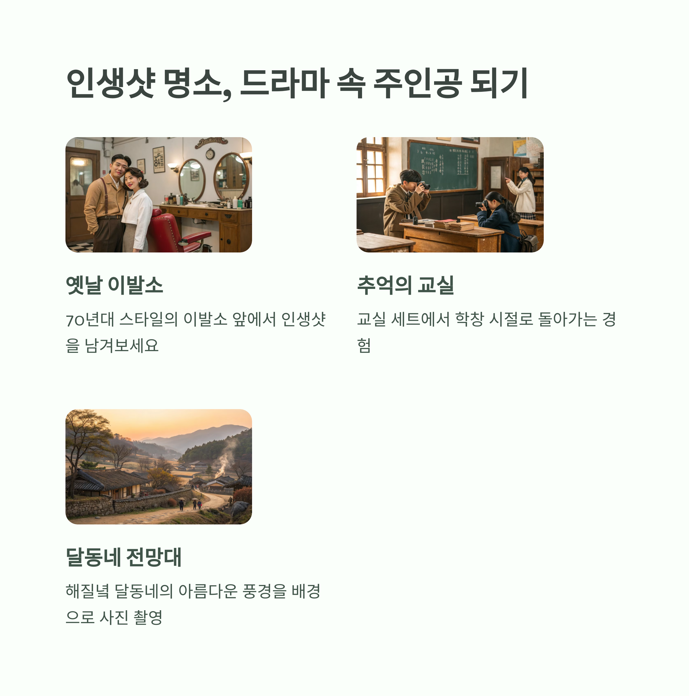 60~80년대 골목, 전통 상점가, 교실, 달동네 등 다양한 시대 배경 포토존이 마련되어 있어 드라마 속 주인공처럼 사진을 남기기에 좋습니다.