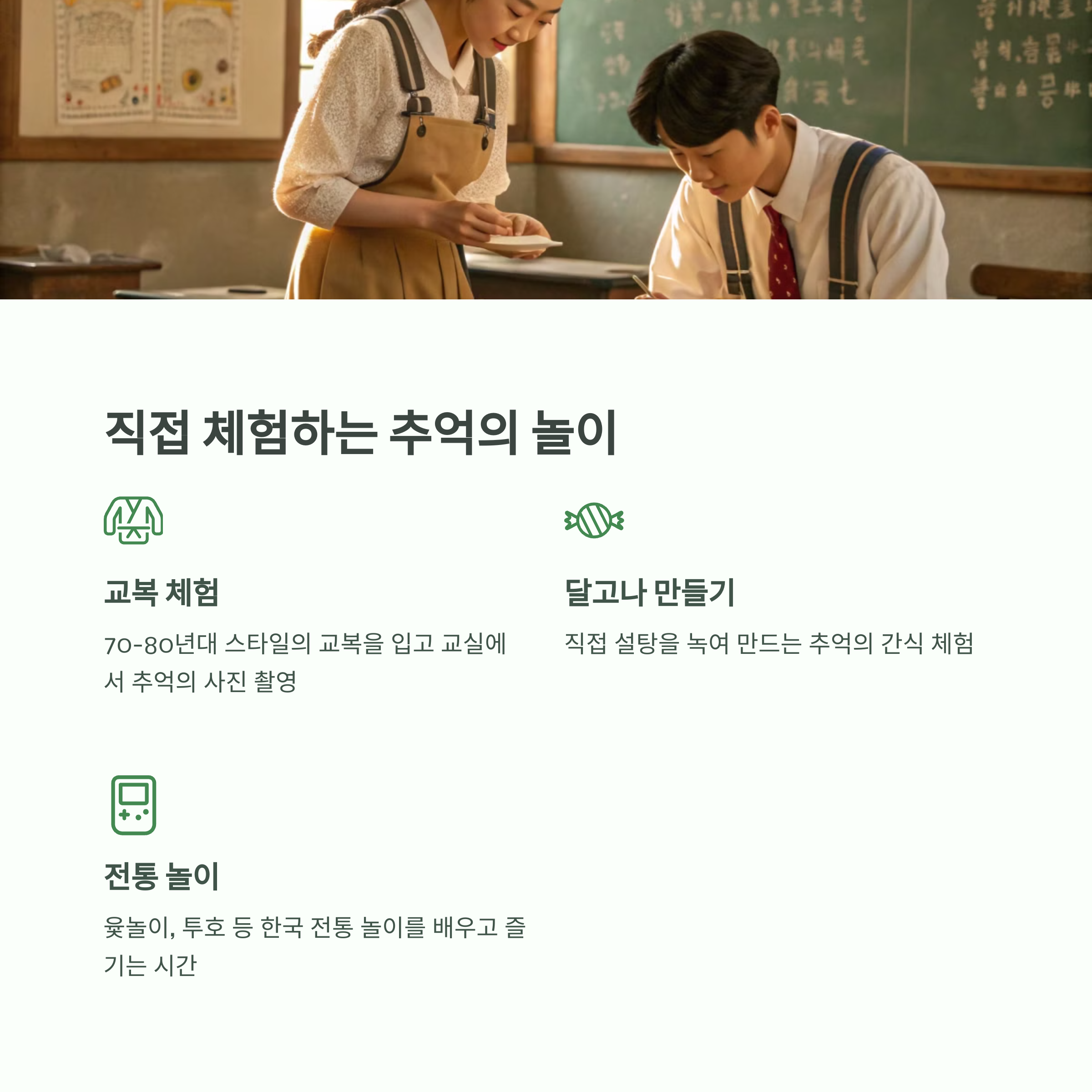 이곳에서만 느낄 수 있는 특별한 체험 프로그램들도 인기 요소입니다. 실제 드라마 속에 등장했던 장면을 연출해볼 수 있는 포토존은 SNS 인증샷 장소로 사랑받고 있으며, 교복 체험, 달고나 만들기, 오래된 교실 체험 등은 아이들과 함께 방문한 가족 단위 관광객에게 특히 인기가 많습니다. 세대 간 소통의 공간으로 활용되기도 하며, 부모 세대가 자녀에게 과거의 이야기를 자연스럽게 전할 수 있는 감성의 장이 됩니다.