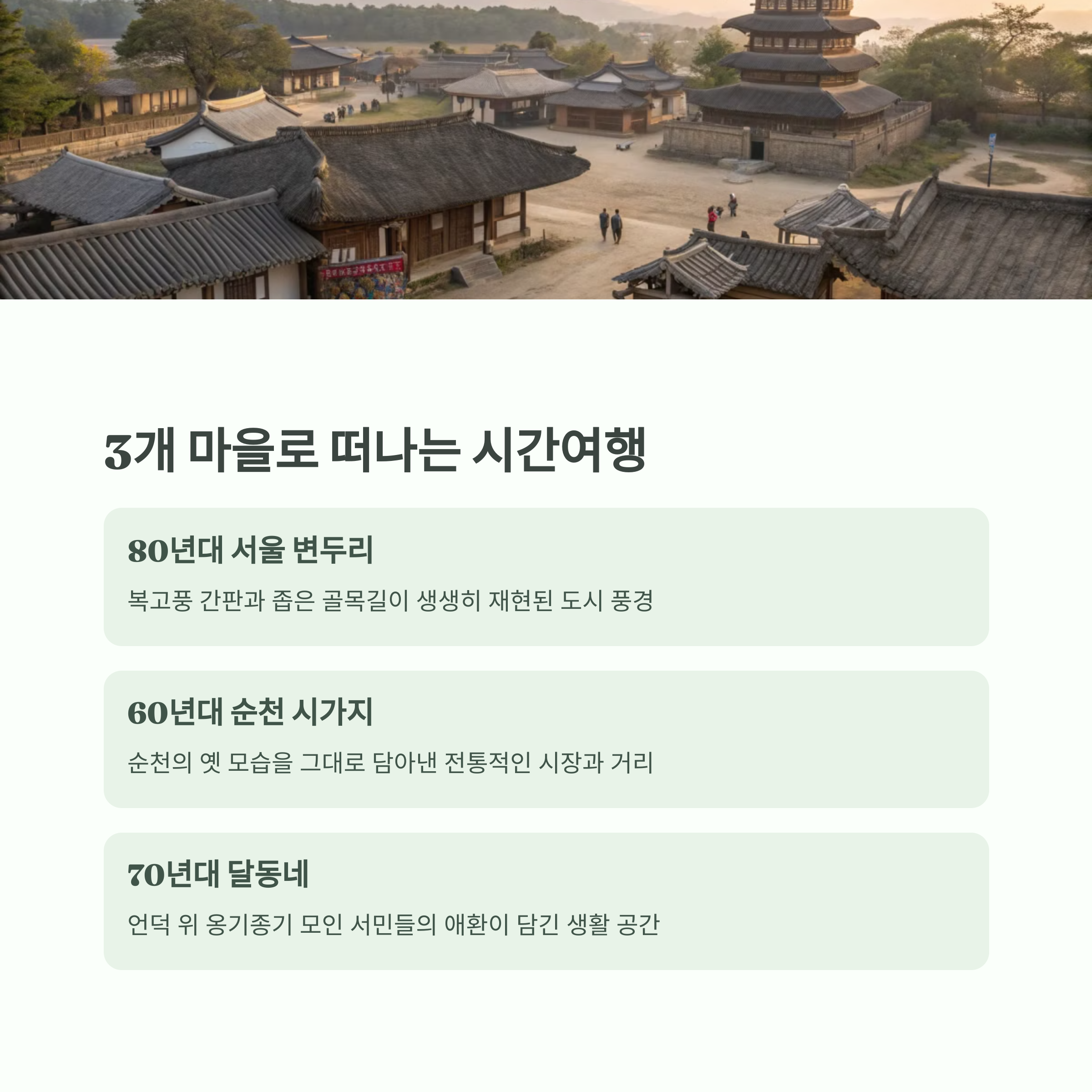 오늘은 순천 드라마세트장으로 여러분을 초대합니다. 1960년대부터 1980년대까지의 시대상이 생생하게 재현된 이곳은 단순한 관광지를 넘어 대한민국의 역사와 정서를 담아낸 공간입니다. 마치 드라마 속 한 장면처럼 펼쳐지는 골목길과 전통 가옥, 그리고 거리 곳곳의 상점과 극장은 추억을 되새기고 새로운 감동을 안겨줍니다. 방문객들은 이곳에서 시간 여행을 하듯 과거의 따뜻한 정취를 온몸으로 느낄 수 있으며, 체험형 프로그램을 통해 드라마 주인공이 된 듯한 감성을 직접 체험할 수 있습니다. 특히 80년대 서울 변두리, 60년대 순천 시가지를 그대로 옮겨놓은 세트장은 시대별 디테일을 놓치지 않아 감탄을 자아냅니다. 이처럼 순천 드라마세트장은 과거를 추억하며 가족, 친구, 연인과 함께 오감만족 여행을 즐길 수 있는 특별한 장소로 자리매김하고 있습니다.