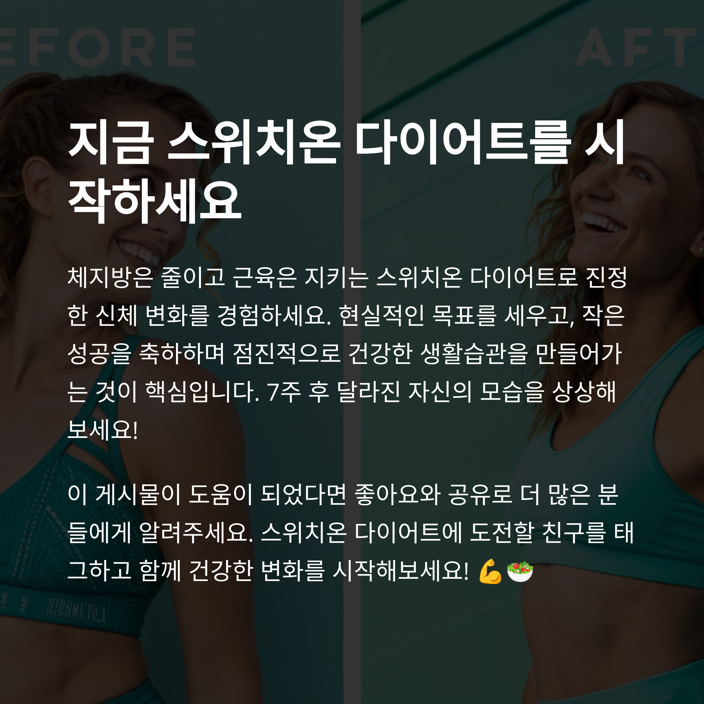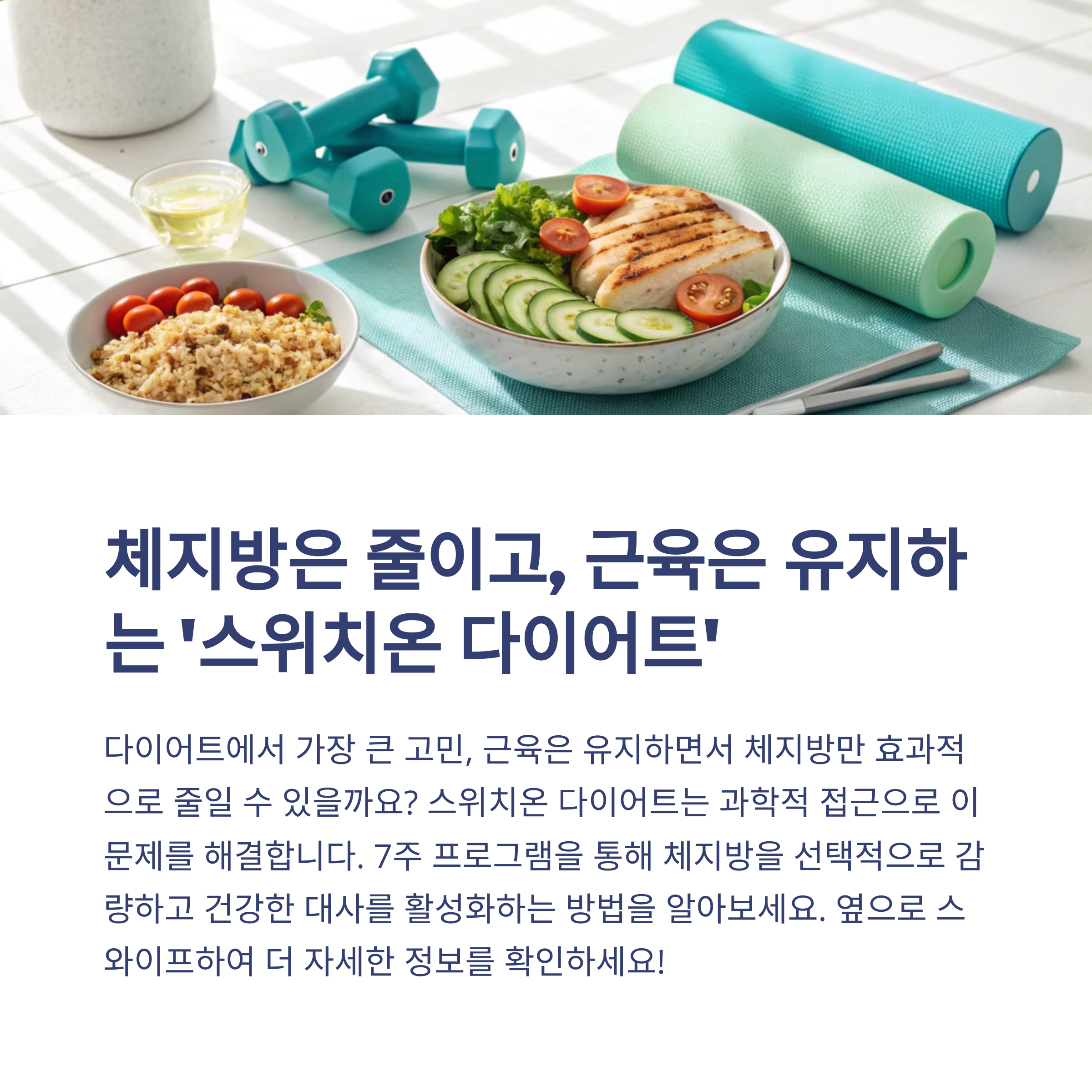 스위치온 다이어트는 단순한 유행이 아닌, 신체 대사의 원리를 반영한 과학적인 방식입니다. 단기간 체중 감량보다 근육량을 지키며 체지방을 감량하는 것이 핵심이며, 각자의 생활 패턴에 맞게 식단과 운동을 조절하는 것이 중요합니다. 오늘부터 7주간 도전해보며 몸의 변화를 기록해보세요. 꾸준히 실천하는 분들에게는 건강한 몸과 습관이 남게 될 것입니다.