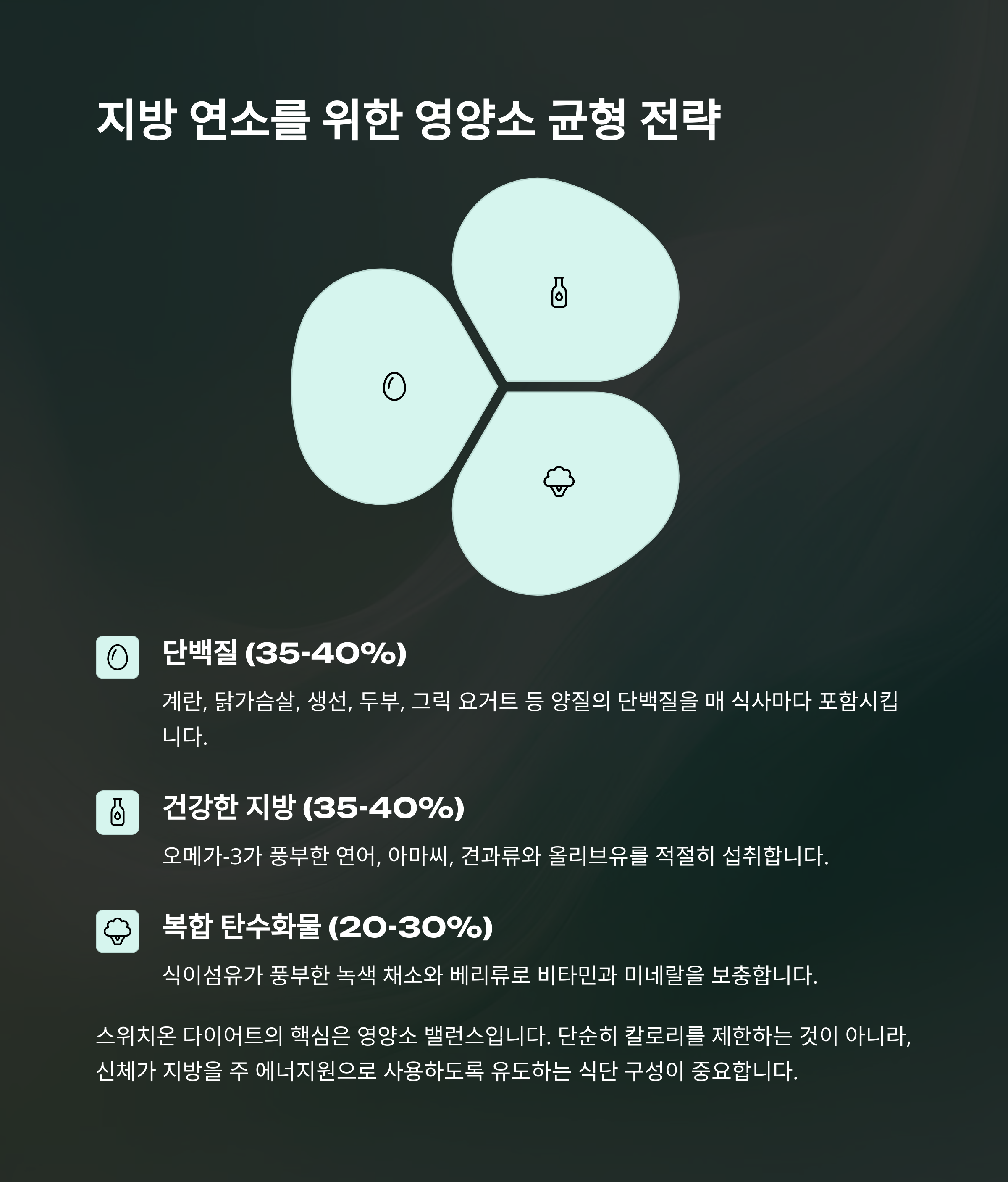 스위치온 다이어트는 체지방만 집중적으로 감량하고, 근육량을 유지하는 데 초점을 맞춘 식단 관리법입니다. 단백질과 건강한 지방을 중심으로 식사를 구성하고, 정제된 탄수화물은 최대한 제한합니다. 이를 통해 지방 대사를 활성화하고, 신체가 에너지원으로 지방을 더 잘 사용하는 상태로 전환됩니다. 특히, 현미와 잡곡밥 등의 복합 탄수화물을 소량 섭취하고 공복 시간을 늘리면 더 빠른 연소 효과를 얻을 수 있습니다.