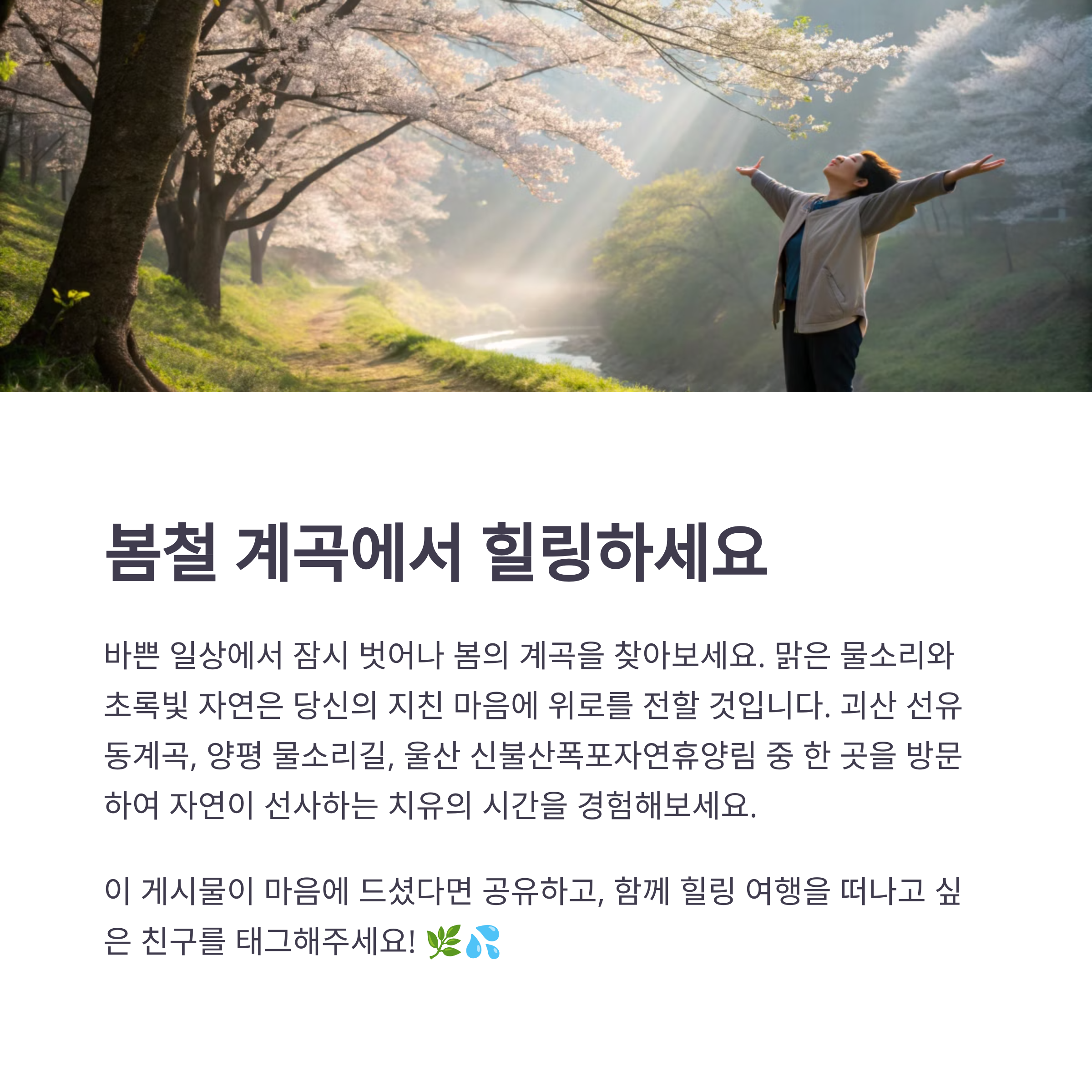 | 봄 계곡 명소 | 괴산 선유동, 양평 물소리길, 울산 신불산 등 |
