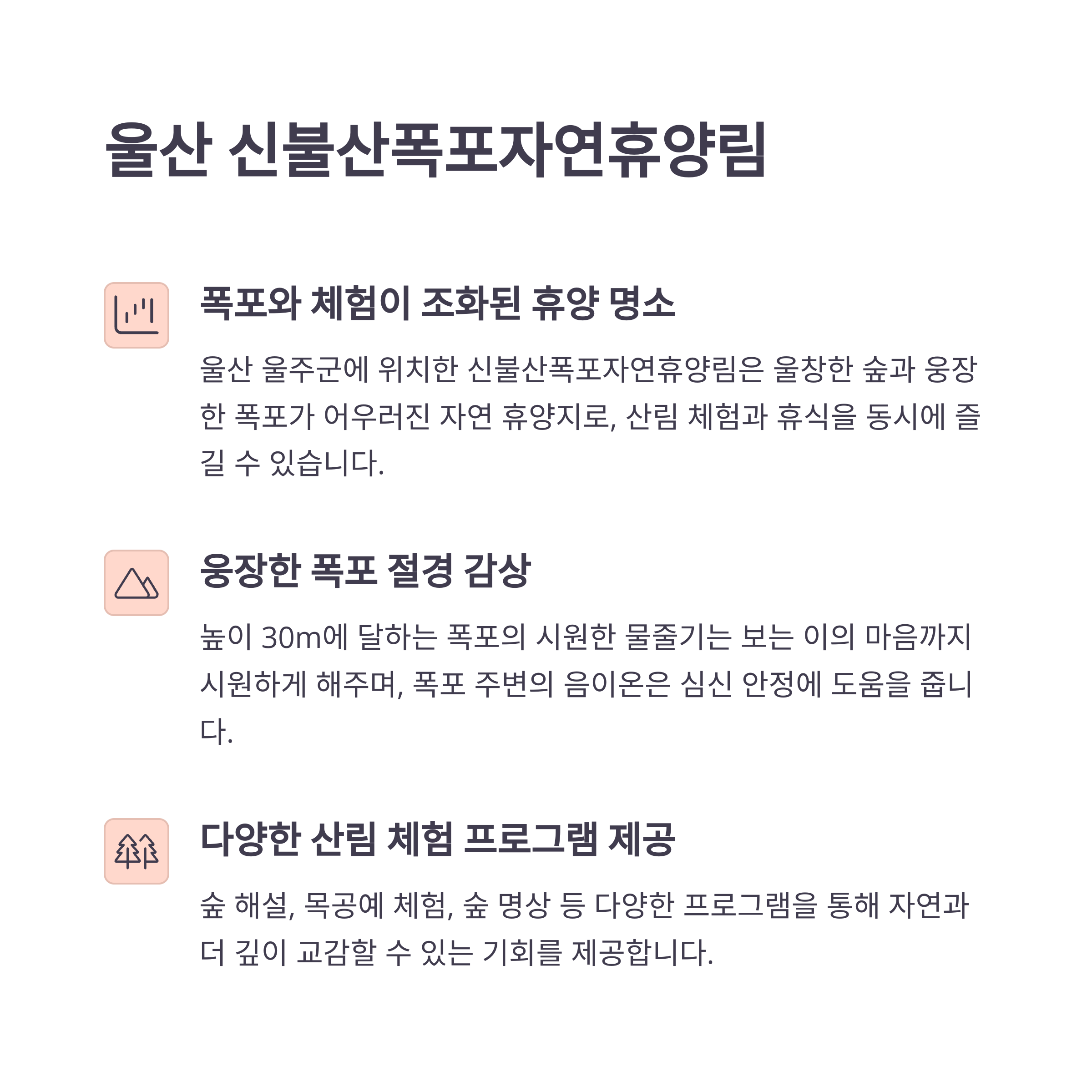 울산 신불산폭포자연휴양림은 봄철 자연 그대로의 아름다움을 체험할 수 있는 최적의 힐링 공간입니다. 파래소 폭포와 숲속 산책로는 자연과 하나되는 느낌을 전달하며, 숲속 캠핑과 목공예 체험은 가족이나 연인과 함께하는 추억을 쌓기에 안성맞춤입니다. 물소리와 숲의 고요함이 어우러져 스트레스를 잊게 만들어 줍니다.