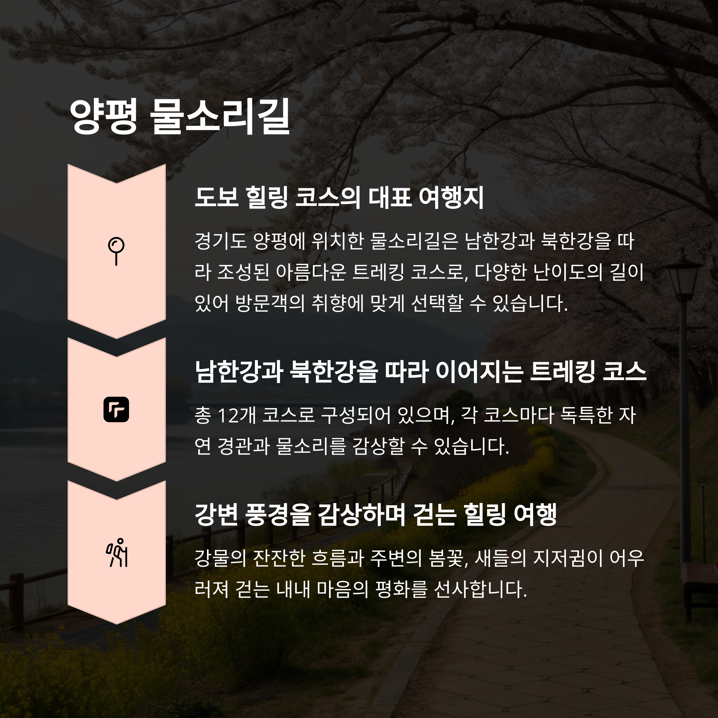 양평 물소리길은 도심과 가까우면서도 남한강과 북한강의 물소리를 고스란히 느낄 수 있는 힐링 코스입니다. 특히 4코스인 양평역부터 원덕역 구간은 봄꽃과 계곡물이 어우러져 걷는 내내 자연의 품에 안긴 듯한 평온함을 선사합니다. 길을 따라 들리는 기차 소리와 강변의 작은 등대는 여행의 감성을 더해주는 포인트입니다.