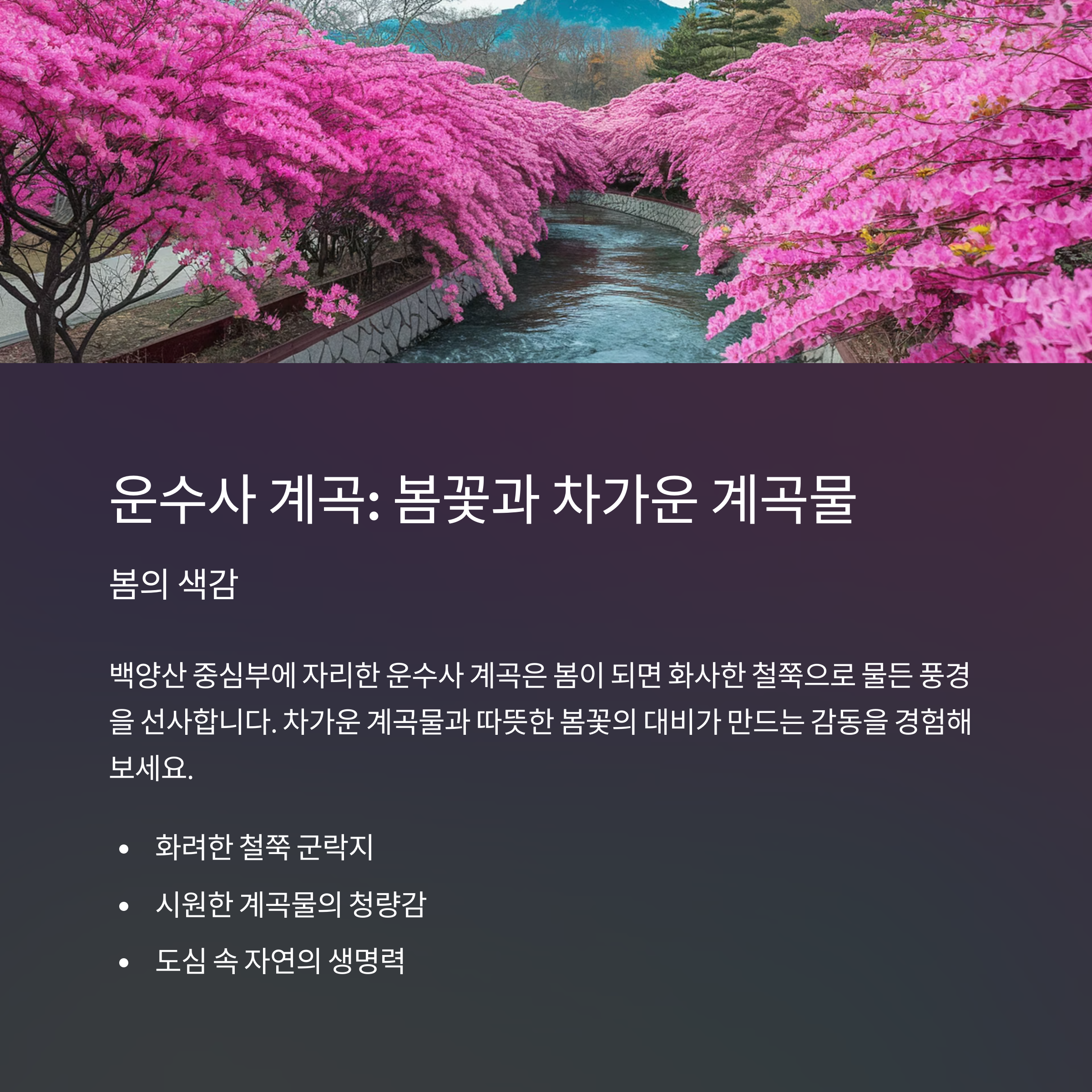 Q. 운수사 계곡의 봄철 특징은 무엇인가요? |