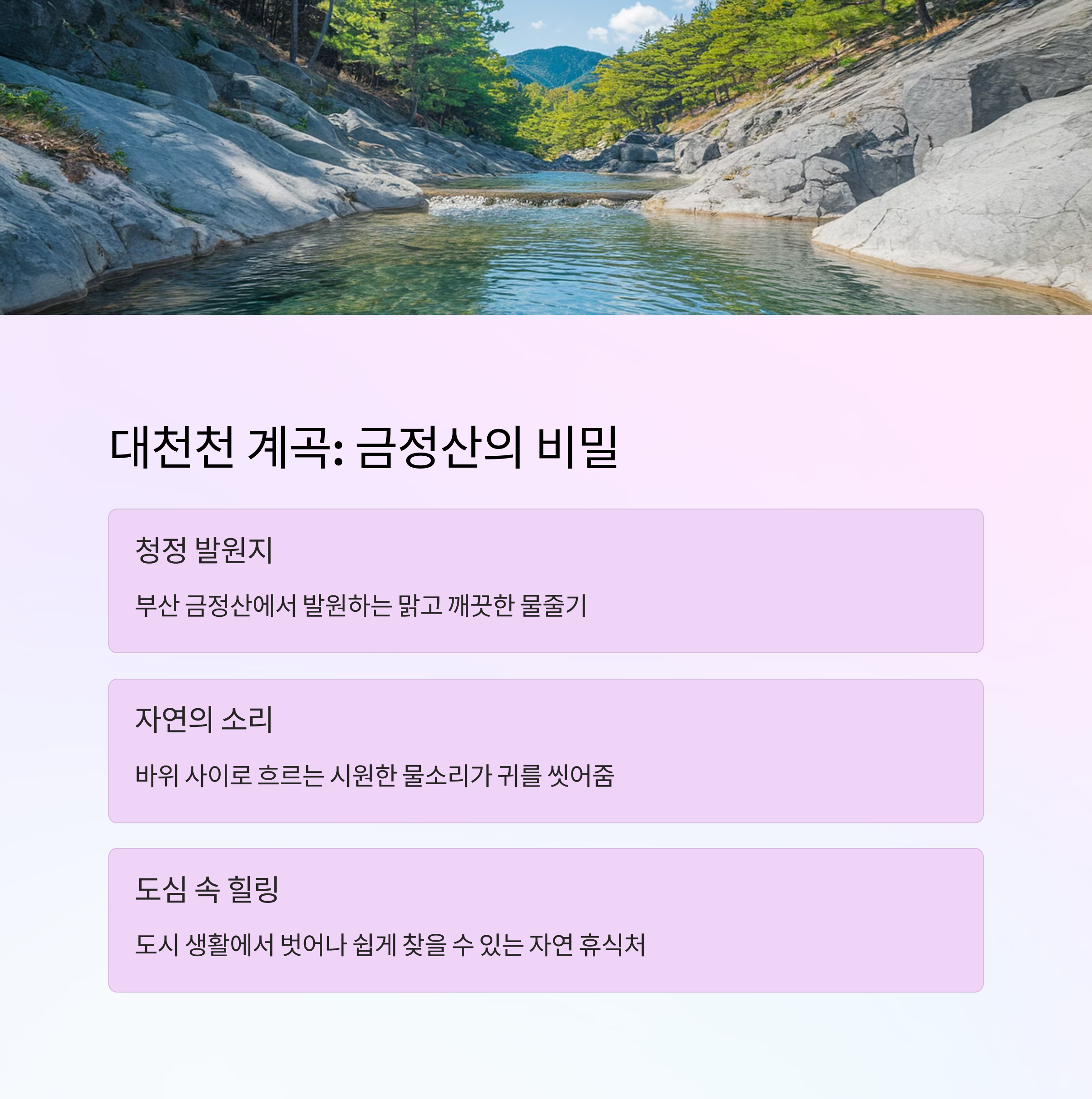 첫 번째로 소개할 명소는 부산 금정산에 위치한 대천천 계곡입니다.