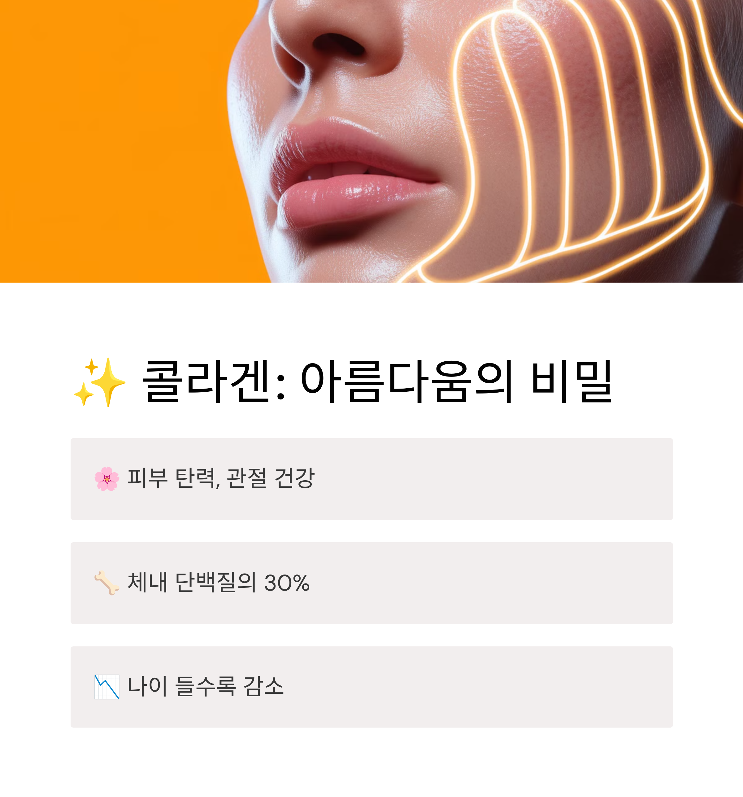콜라겐은 외적인 아름다움뿐 아니라 관절 건강과 혈관 탄력에도 도움을 주는 기능성 단백질입니다. 특히 30대 이후부터는 콜라겐 생성량이 감소하기 시작하여 꾸준한 관리가 필요합니다.