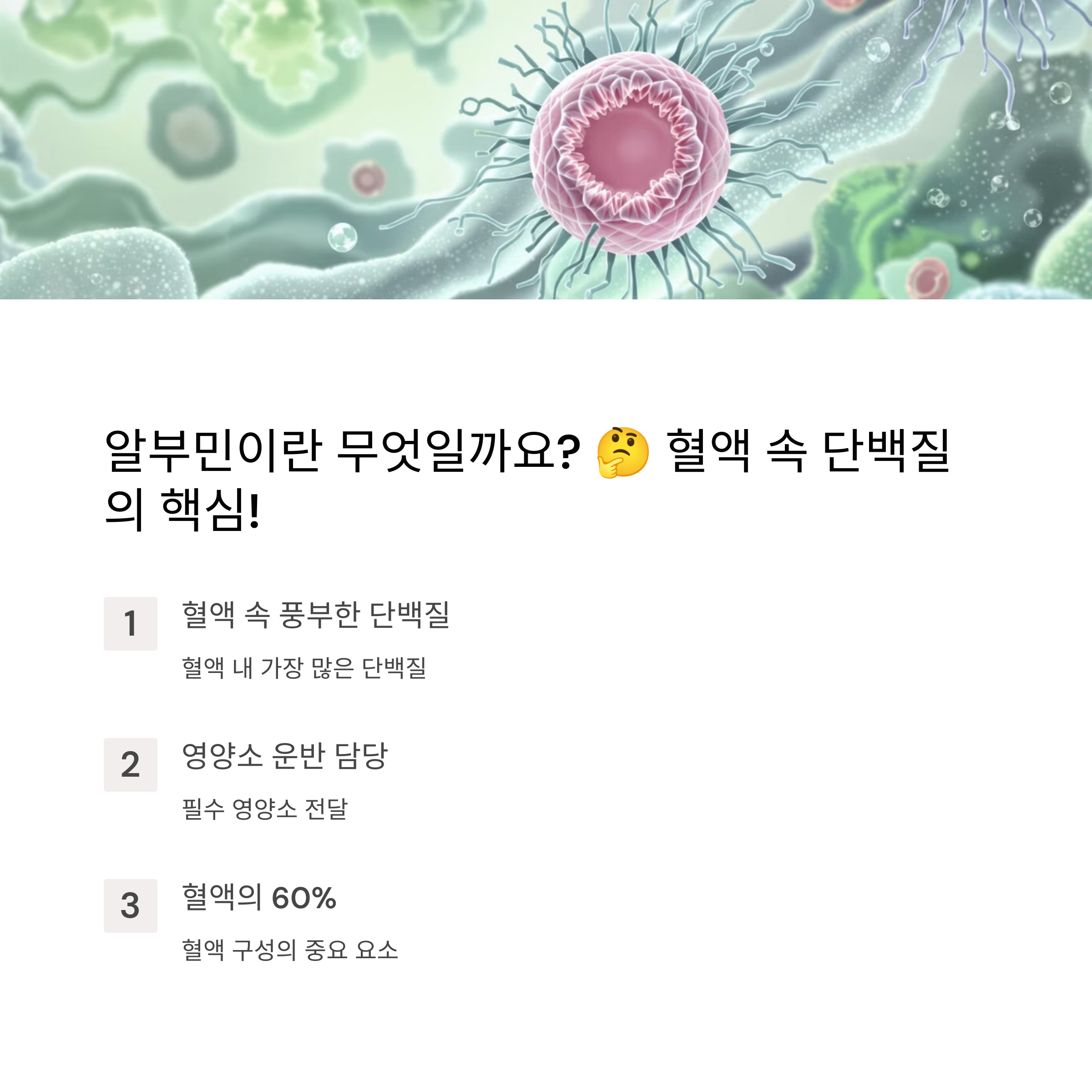알부민은 단순한 단백질이 아니라 우리 몸의 건강을 유지하는 필수 영양소입니다.