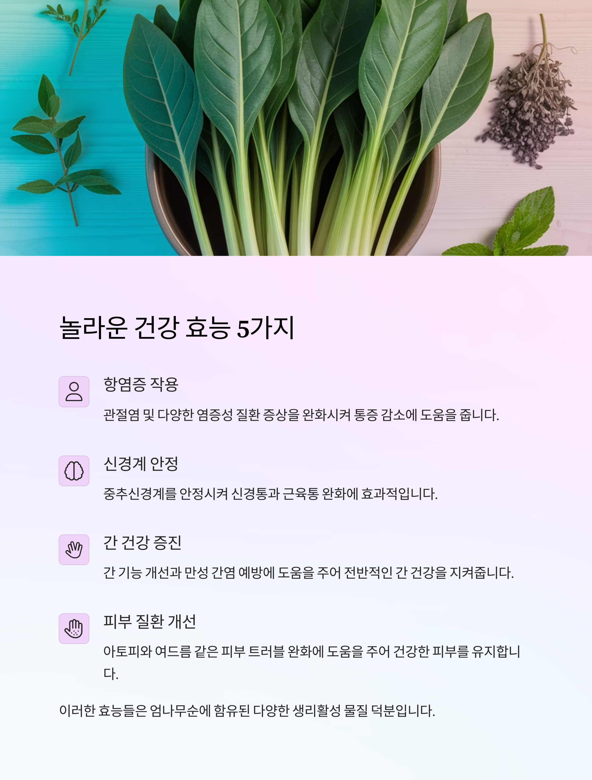 대표 효능 1: 항염증 | 몸의 염증 반응 조절과 통증 완화 |