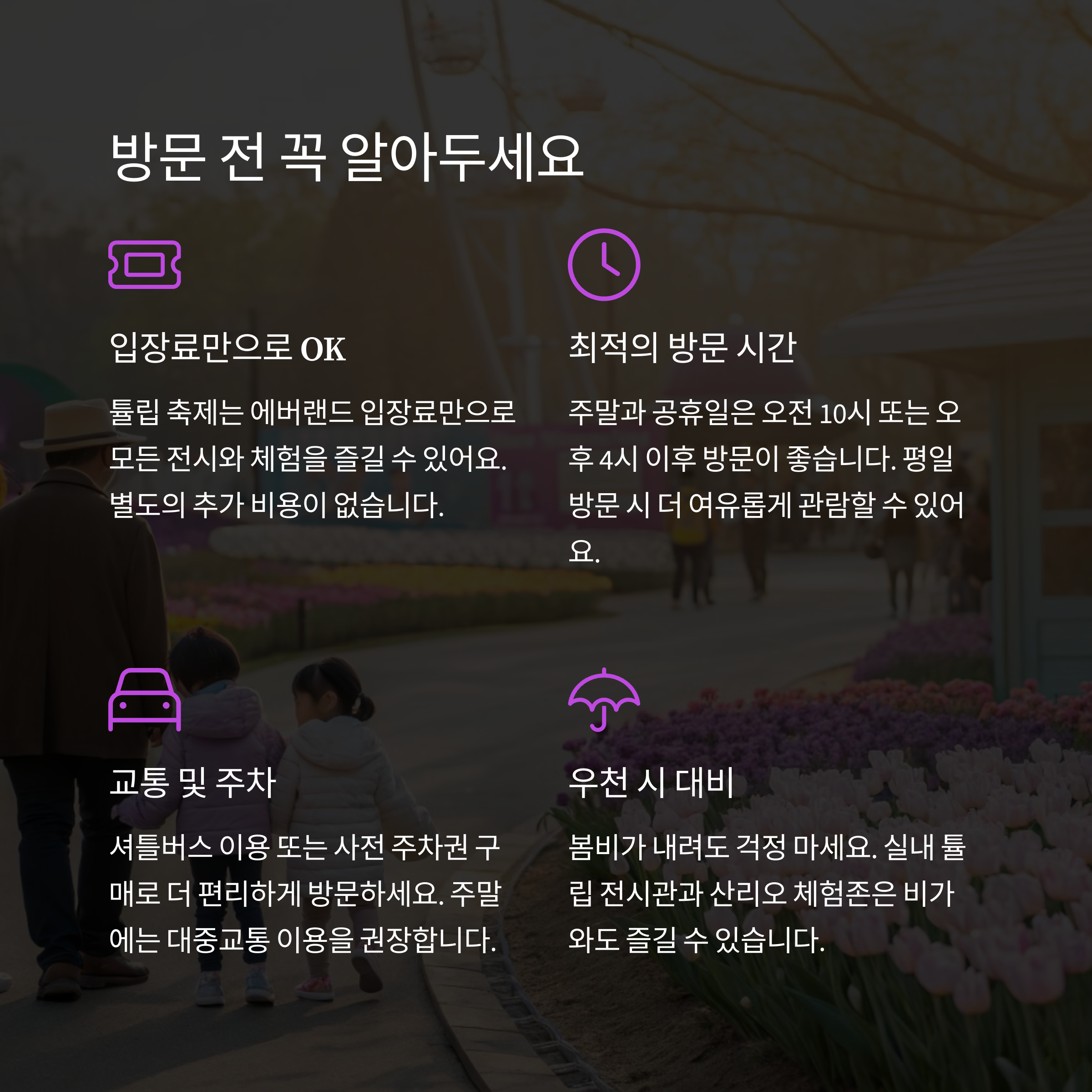 축제 기간은 2025년 3월 21일부터 6월 15일까지로, 튤립이 만개하는 3~4월 사이가 가장 추천되는 방문 시기입니다. 서울에서 대중교통이나 셔틀버스를 이용하면 편리하며, 자차 이용 시 에버랜드 내 주차장도 이용 가능합니다. 다양한 산책로와 캐릭터 테마 공간이 준비되어 있으니, 사전 계획을 세우고 방문하면 더욱 즐거운 시간을 보낼 수 있습니다.