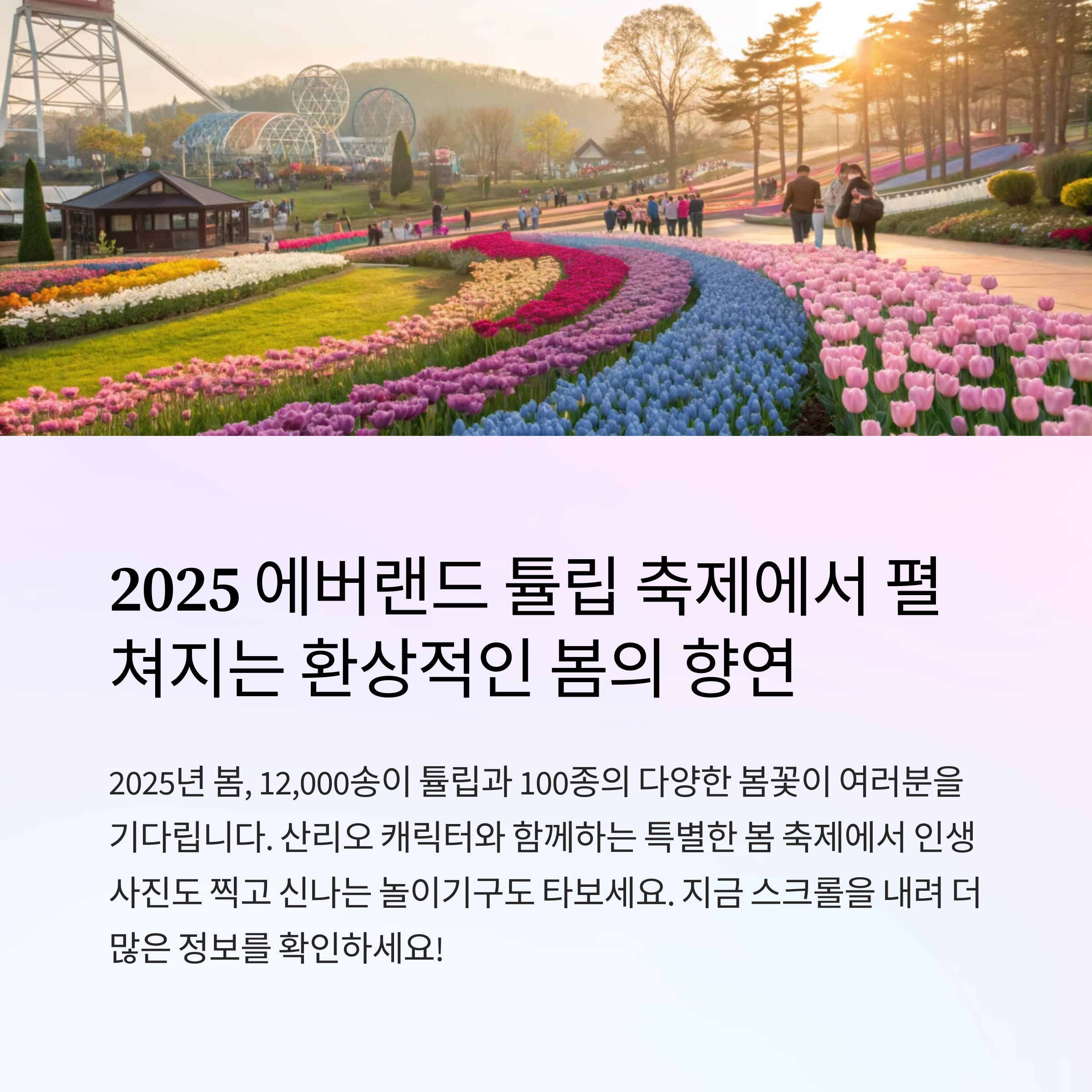 에버랜드 튤립축제는 단순한 전시를 넘어, 오감을 만족시키는 축제로 성장해왔습니다. 특히 놀이기구와 봄꽃이 어우러진 공간은 계절의 아름다움을 고스란히 담아내며, 산리오 캐릭터들과의 만남은 더욱 특별한 순간을 만들어 줍니다. 가족과 연인이 함께 걷기 좋은 산책길, 포토존, 체험존이 곳곳에 마련되어 있어 누구나 만족할 수 있는 시간이 될 것입니다. 봄나들이를 계획하고 있다면, 이번 튤립축제를 놓치지 마세요.