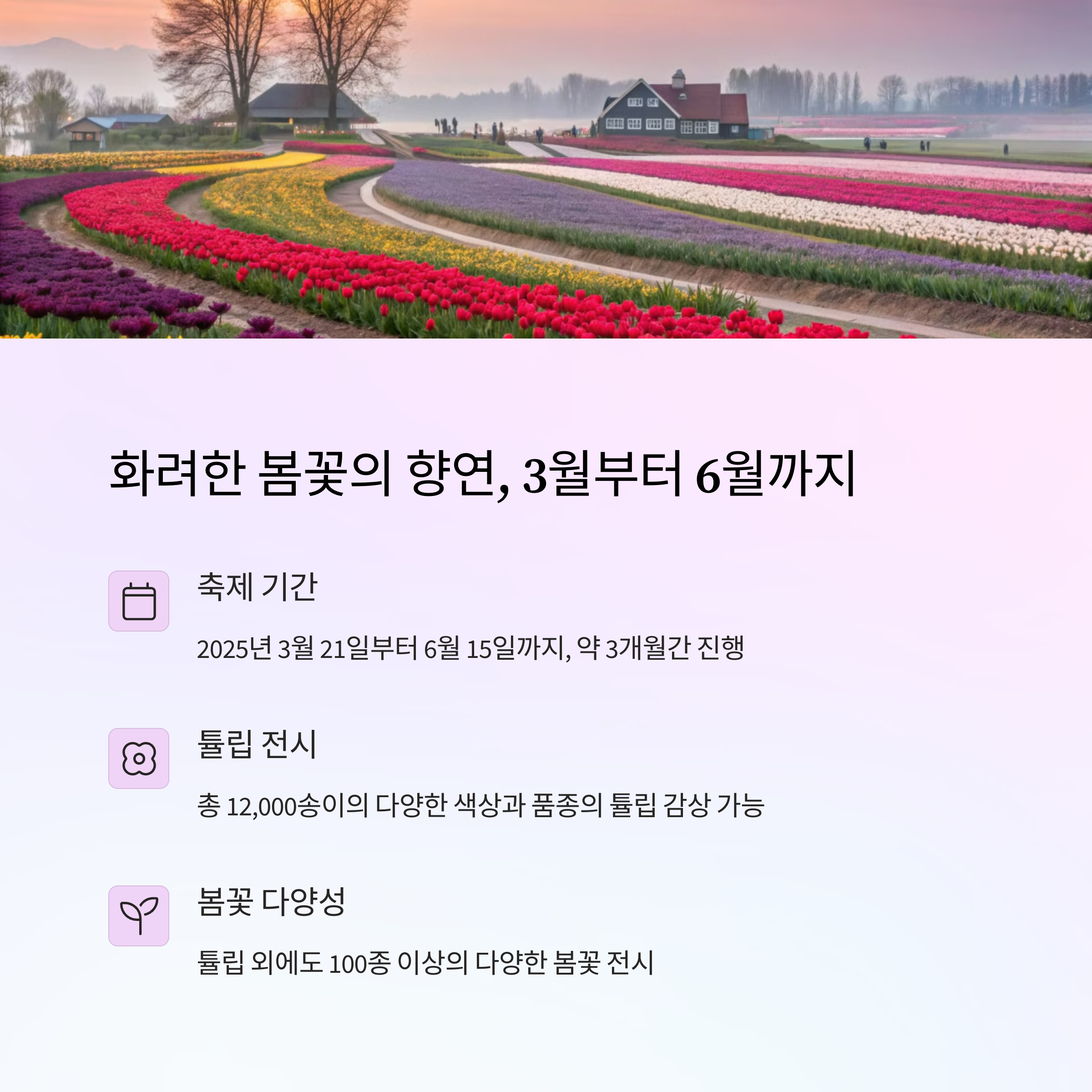 튤립 전시 규모 | 약 1.2만 송이의 튤립과 100종 봄꽃 전시 |