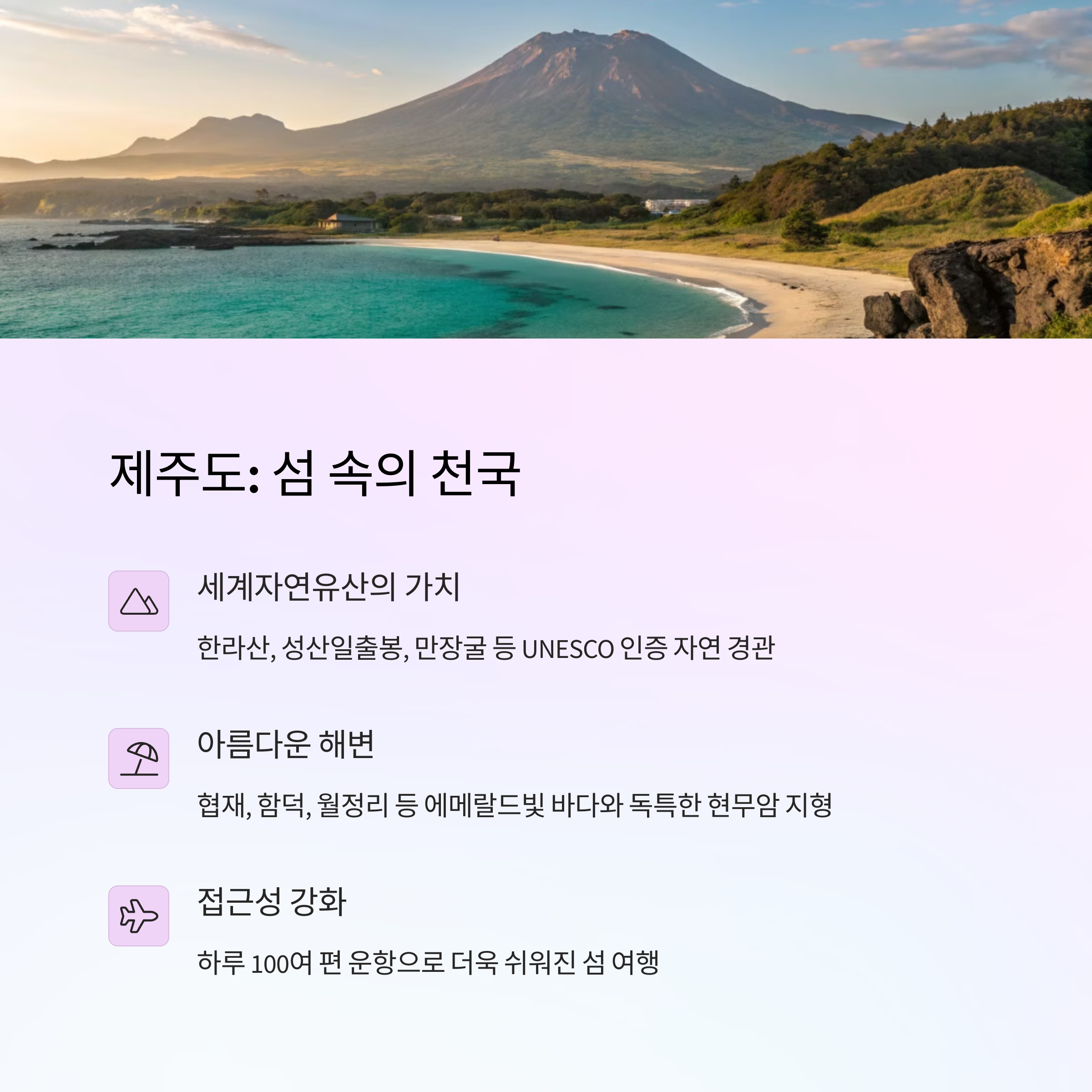 | 전통과 현대가 공존하는 수도 | 자연과 힐링의 섬 | 역사 체험의 최적지 |
