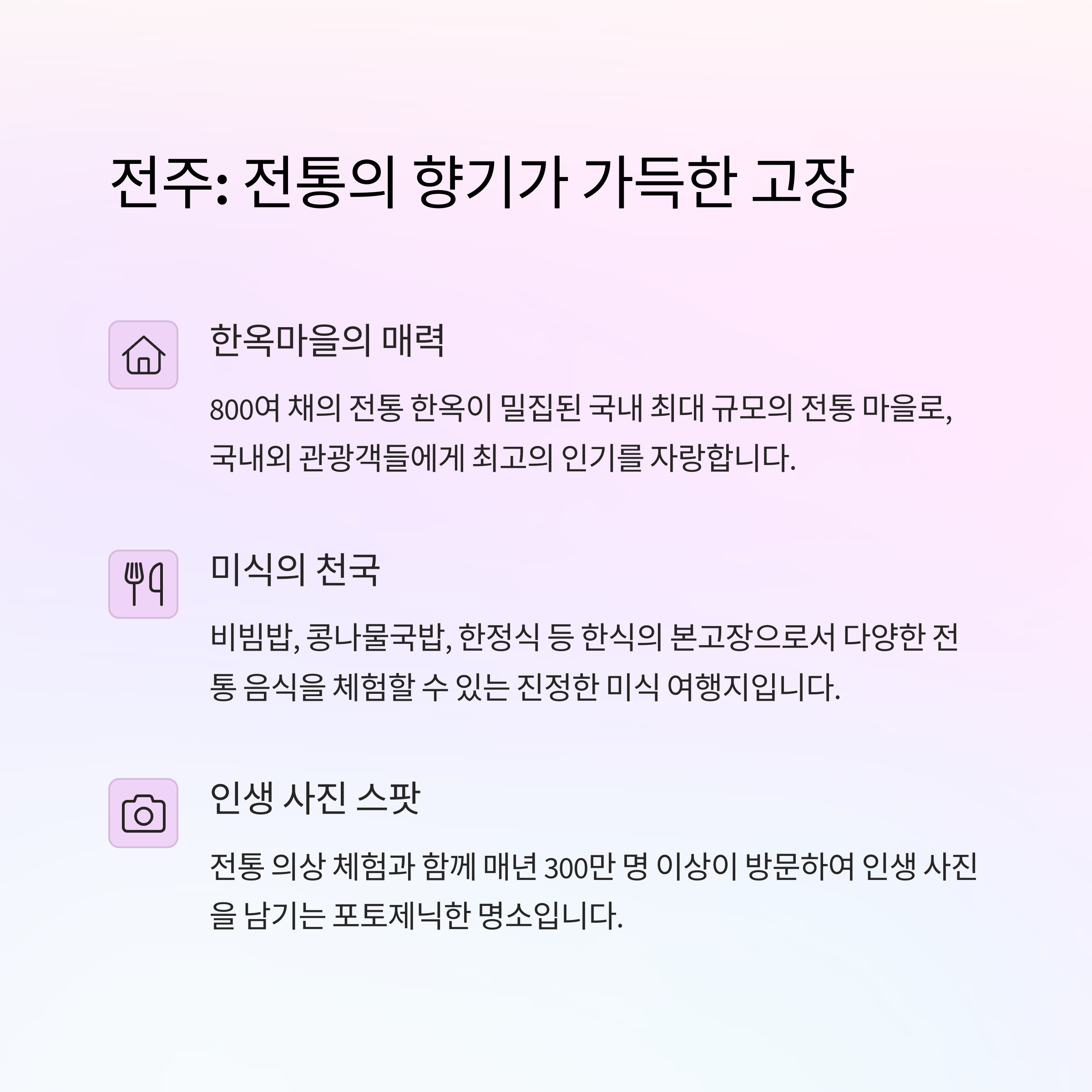 전주는 맛과 멋의 도시로 알려져 있으며, 전주 한옥마을과 비빔밥 거리는 전통적인 건축미와 함께 한국적인 맛을 동시에 경험할 수 있습니다. 최근에는 전통 음식에 대한 관심이 높아지며 국내는 물론 외국인 관광객들에게도 전주의 인기가 크게 상승하고 있습니다. 한국의 고유한 문화와 음식을 체험하고 싶은 이들에게 전주는 꼭 한번 가볼 만한 여행지로 손꼽히고 있습니다.