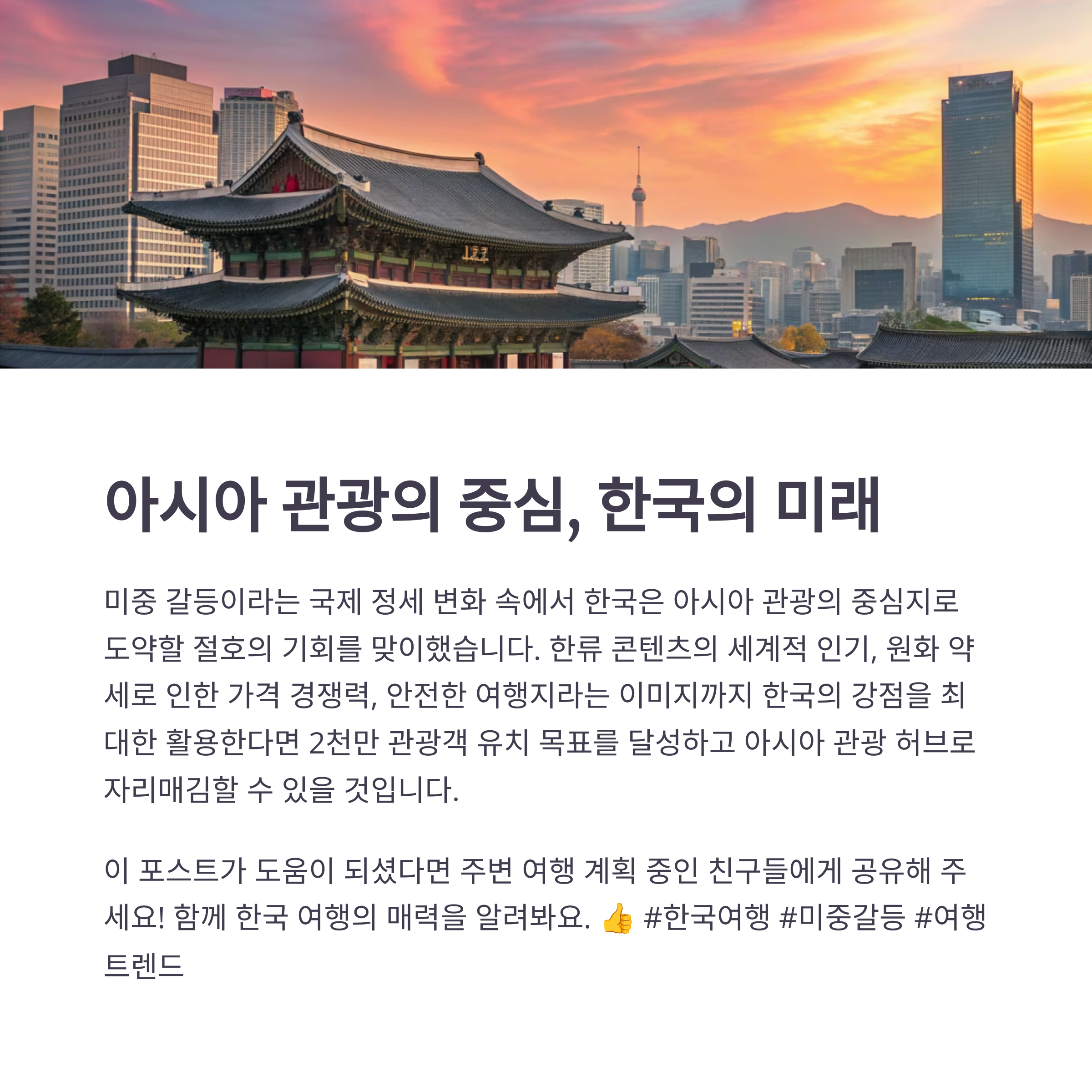한국은 아시아권 관광객 유치를 위해 K-문화와 원화의 경쟁력을 적절히 활용해야 합니다.