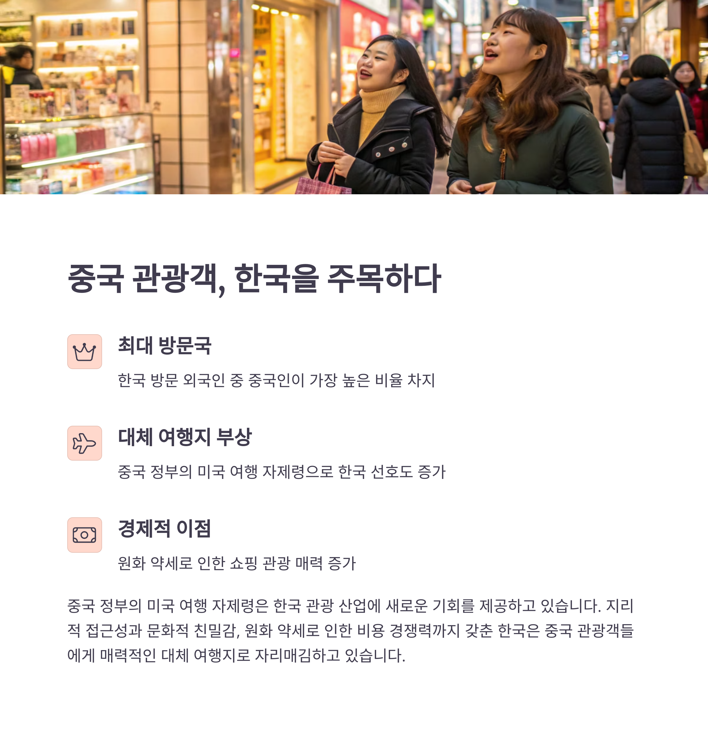 미중 갈등으로 인해 미국 여행 수요가 감소한 반면, 아시아 여행 수요는 증가세를 보였습니다. 중국인이 미국 여행을 자제하는 움직임이 아시아권 여행지로의 이동을 유도했습니다. 특히 한국, 일본, 동남아시아는 대체 여행지로 급부상하며 관광객 유입량을 대폭 늘리고 있습니다. K-콘텐츠와 원화 약세는 중국, 일본, 동남아 지역 관광객들에게 한국의 매력을 높이는 데 기여했습니다. 이러한 변화 속에서 맞춤형 프로모션이 효과적인 전략으로 평가됩니다. |