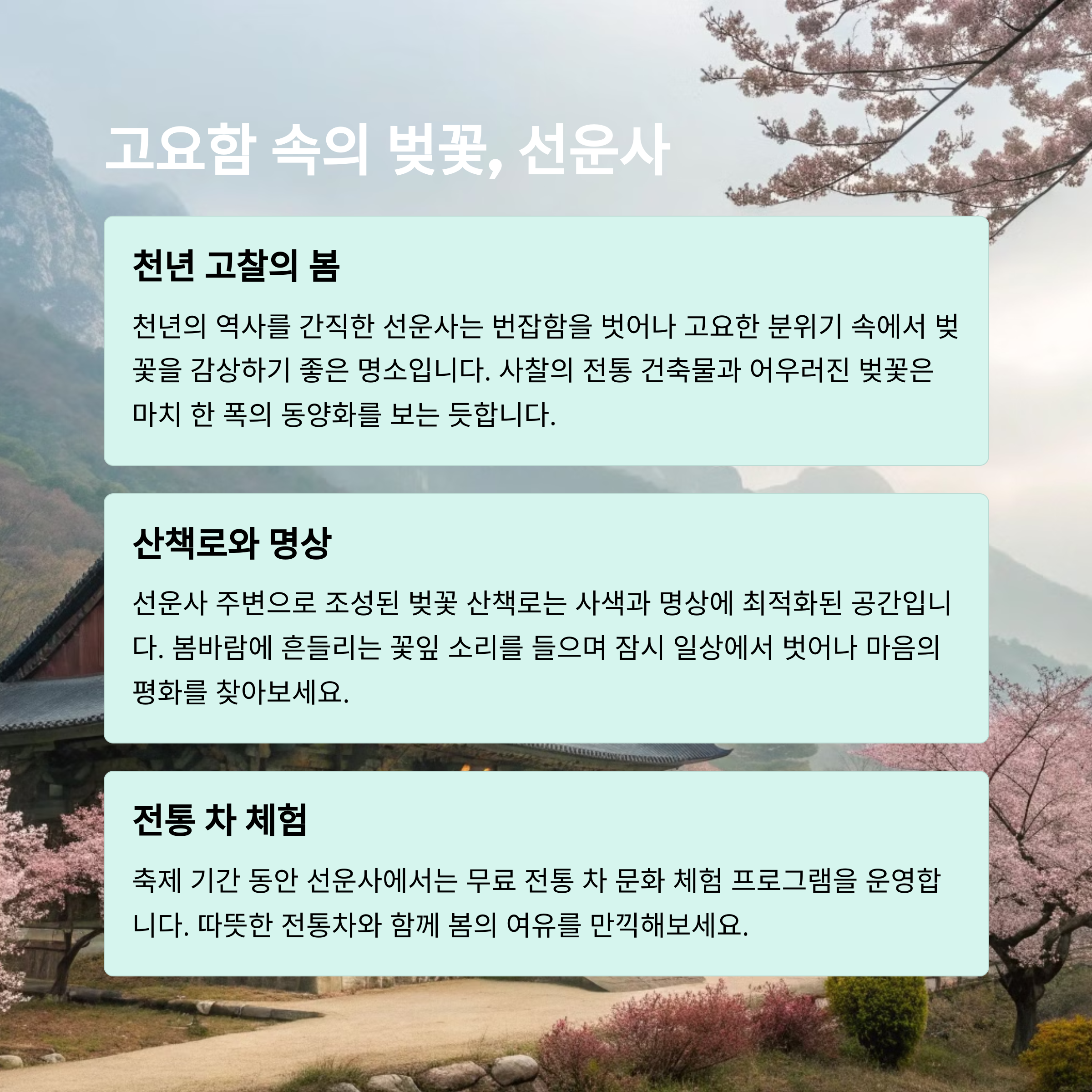 벚꽃축제 중심지, 야경이 아름다운 장소 역사와 자연이 어우러진 전통 명소 사찰 풍경 속 벚꽃길이 인상적인 힐링 장소