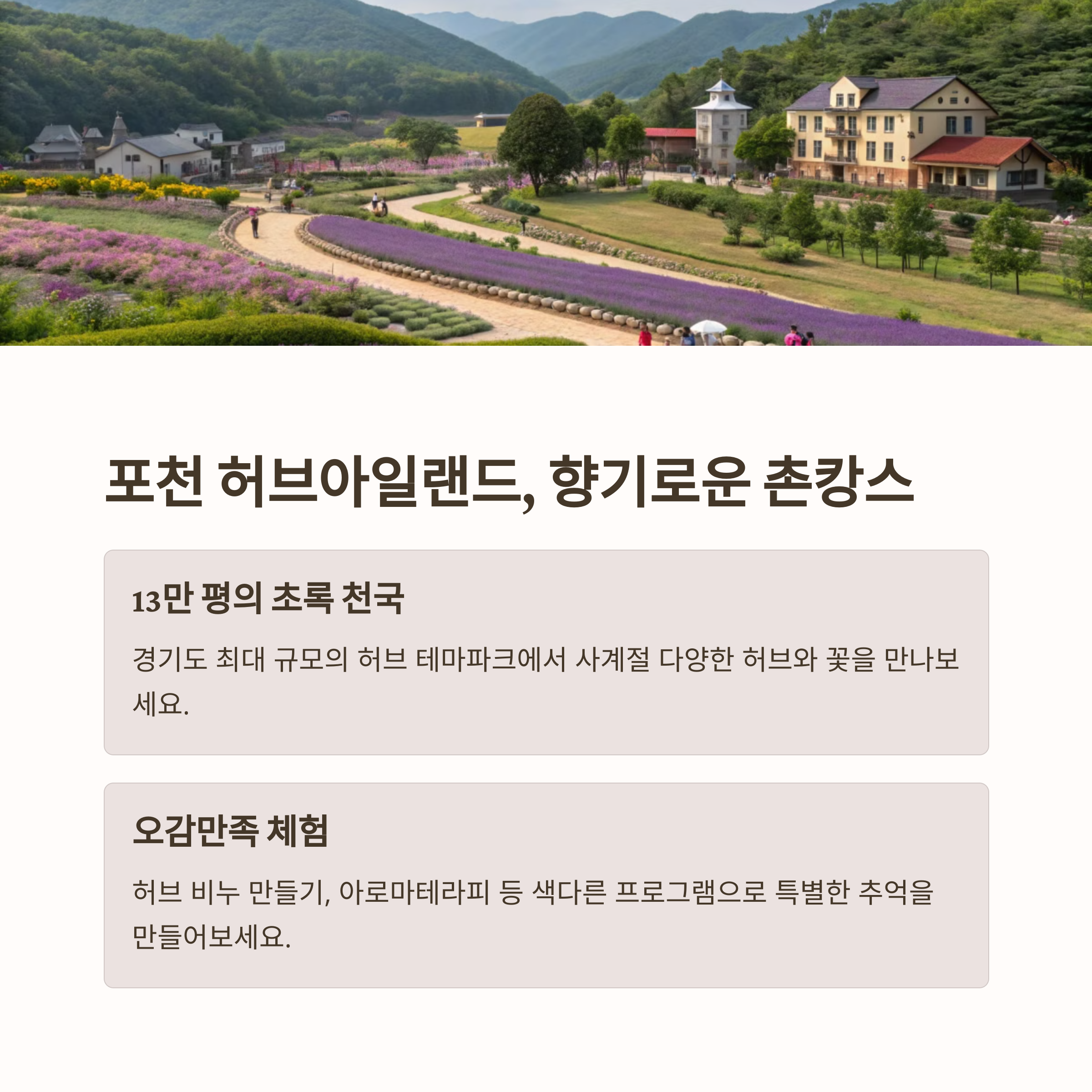 경기도 포천의 허브아일랜드는 촌캉스를 즐기기에 제격인 장소입니다. 13만 평 규모의 허브 테마파크로, 계절마다 다양한 꽃과 허브가 조화를 이루며 시각과 후각 모두를 만족시킵니다. 또한 가평의 전통 민박집은 할머니 집에 온 듯한 포근한 분위기를 제공하여 많은 이들이 다시 찾고 싶어하는 힐링 명소로 꼽히고 있습니다. 이러한 감성 공간은 도시에서는 느낄 수 없는 특별함을 선사합니다.