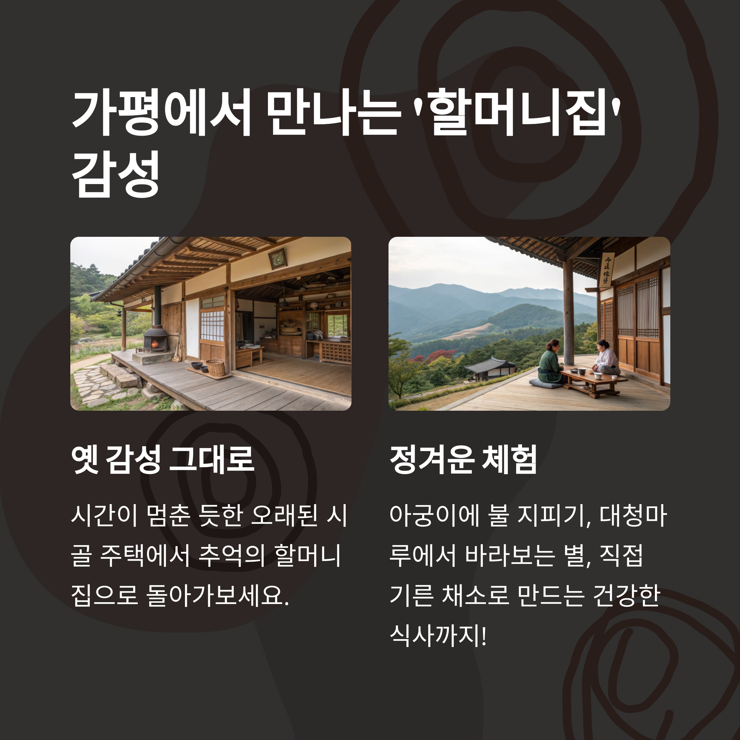 | 포천 허브아일랜드, 가평 전통 민박 | 한옥, 농가 펜션, 감성 민박 | 농산물 체험, 전통 음식 만들기 |