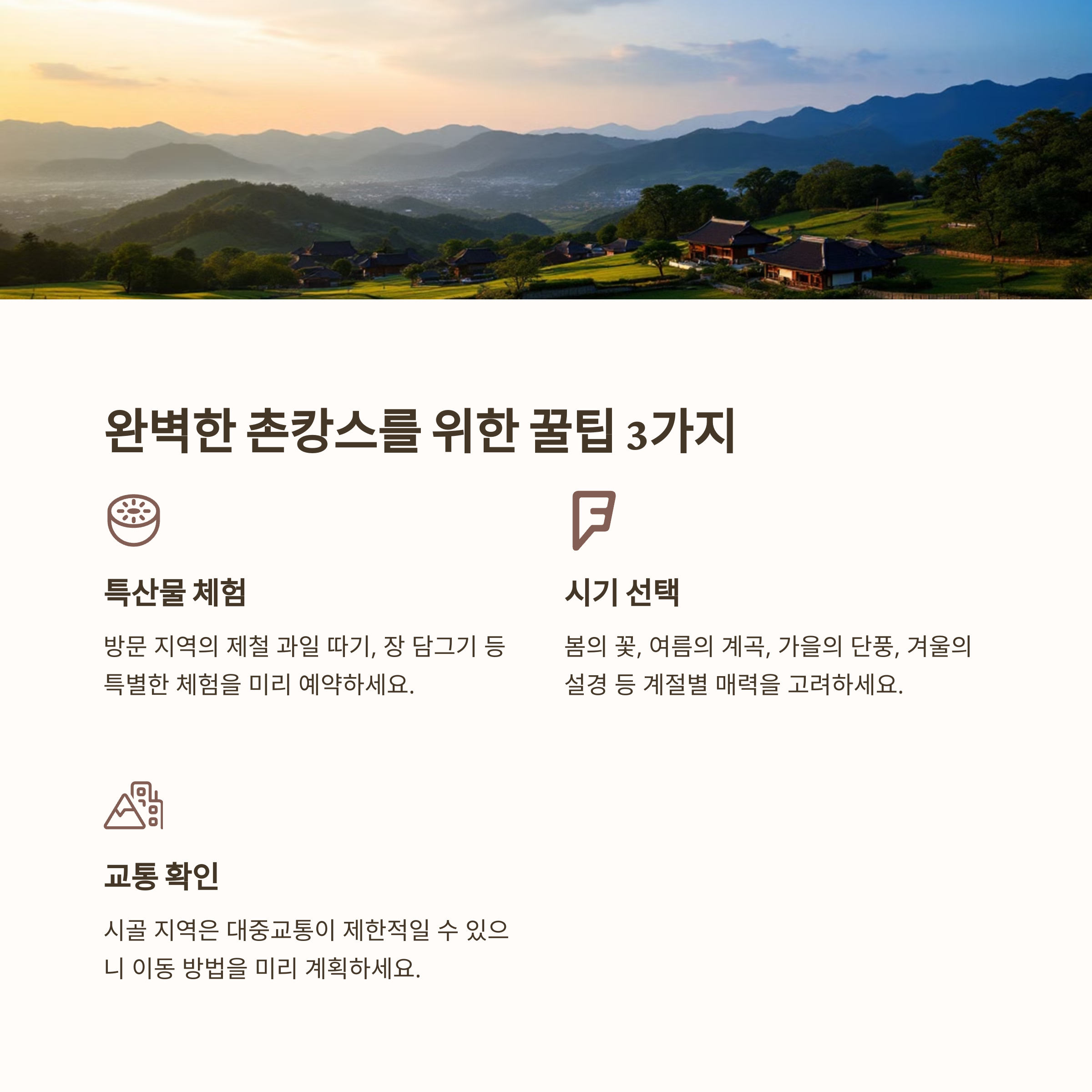 촌캉스의 매력은 단순한 자연 감상이 아닙니다. 시골의 소박한 밥상, 마을 사람들이 직접 운영하는 체험 활동, 그리고 고요한 밤하늘의 별빛까지, 모두가 여행자에게 새로운 감동을 전합니다. 특히 짧은 주말을 활용한 단기 힐링 여행으로 인기를 끌며, 다양한 숙박 형태와 지역 체험을 통해 더 풍부한 추억을 만들 수 있는 기회를 제공합니다.