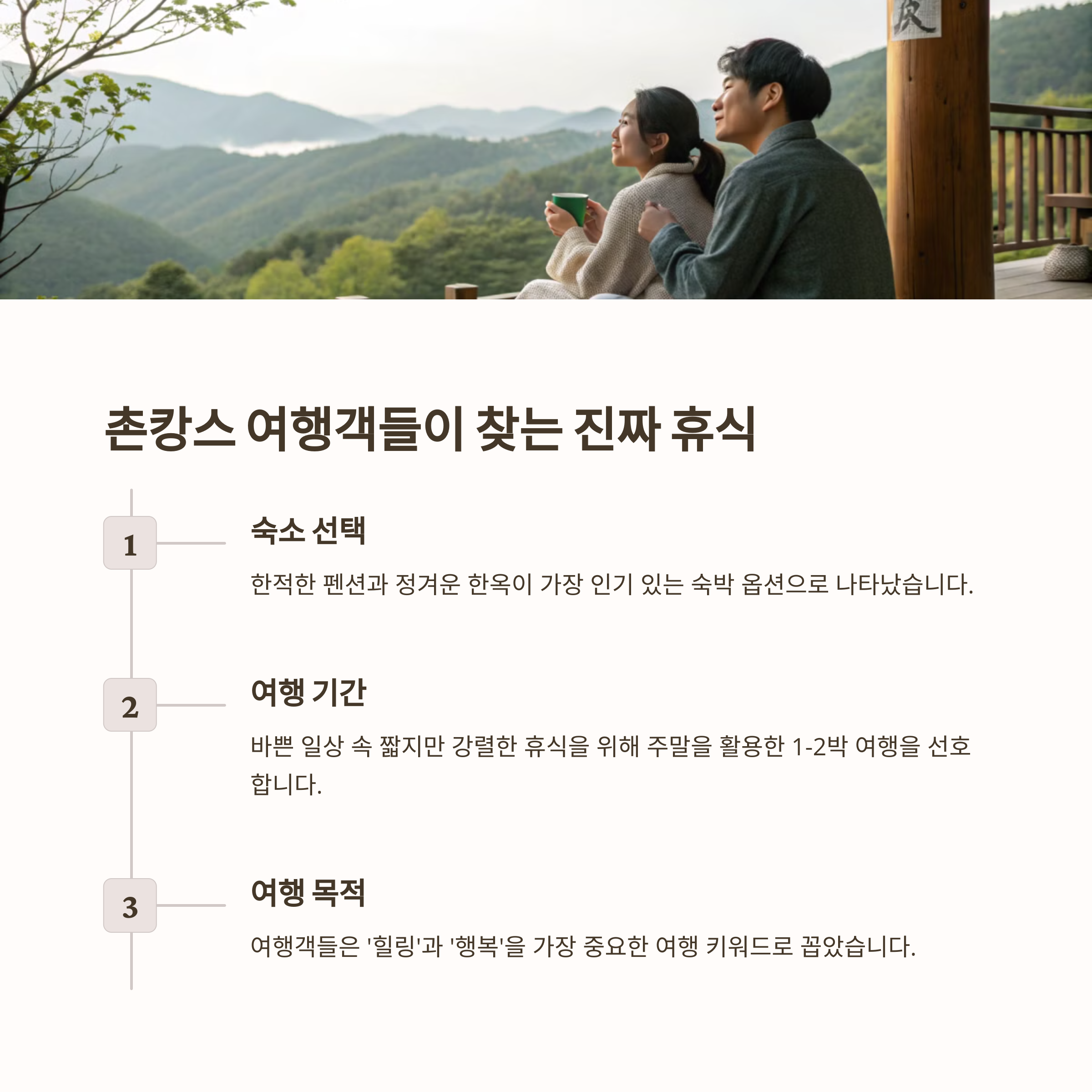 | 촌캉스 인기 이유 | 자연, 감성숙소, 힐링, 그리고 로컬 체험까지 가능 |
