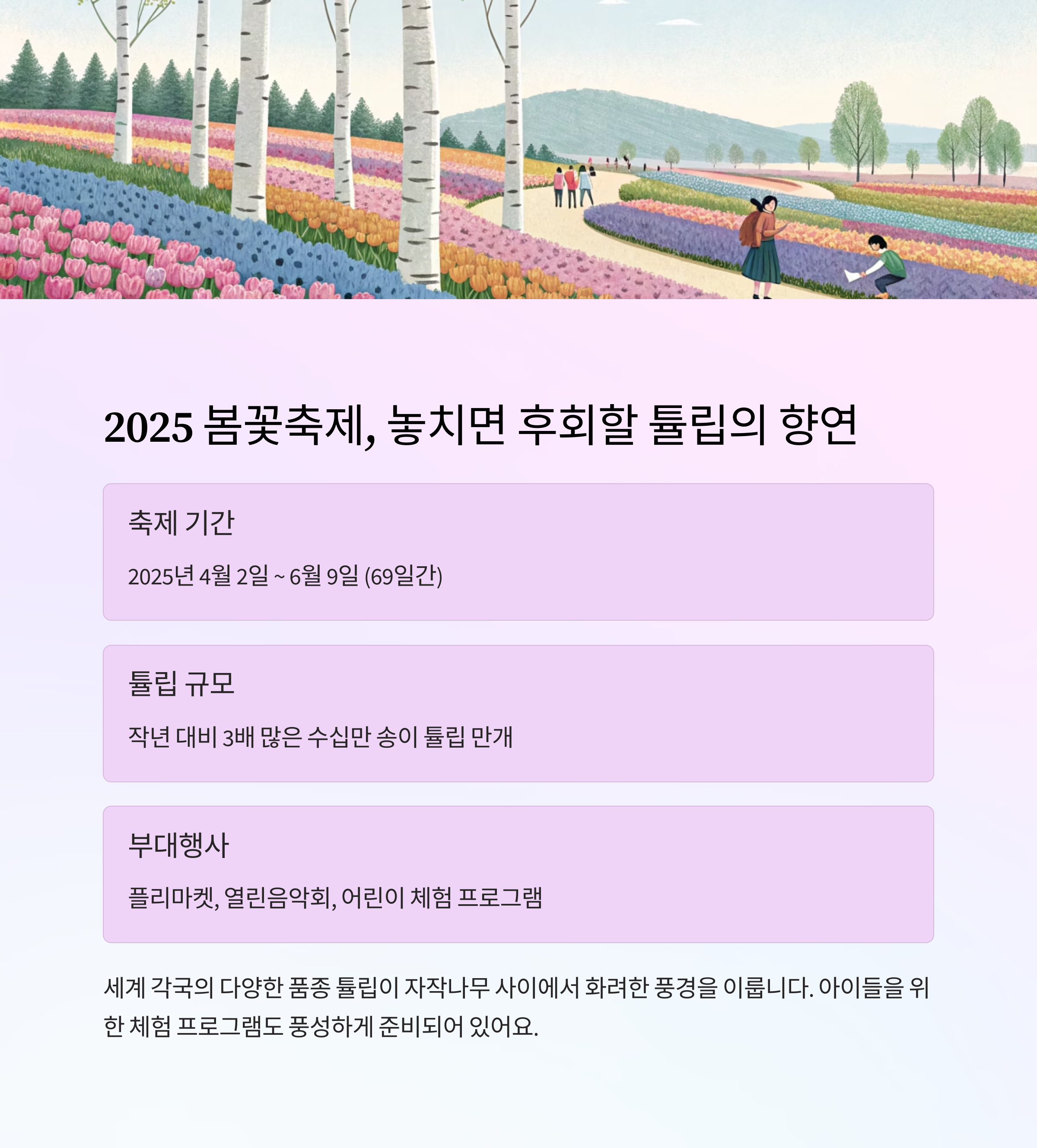 특히, 2025년 봄부터 진행되는 튤립 축제는 자작나무숲의 푸르름과 어우러져 화려한 색깔의 꽃길이 펼쳐집니다.