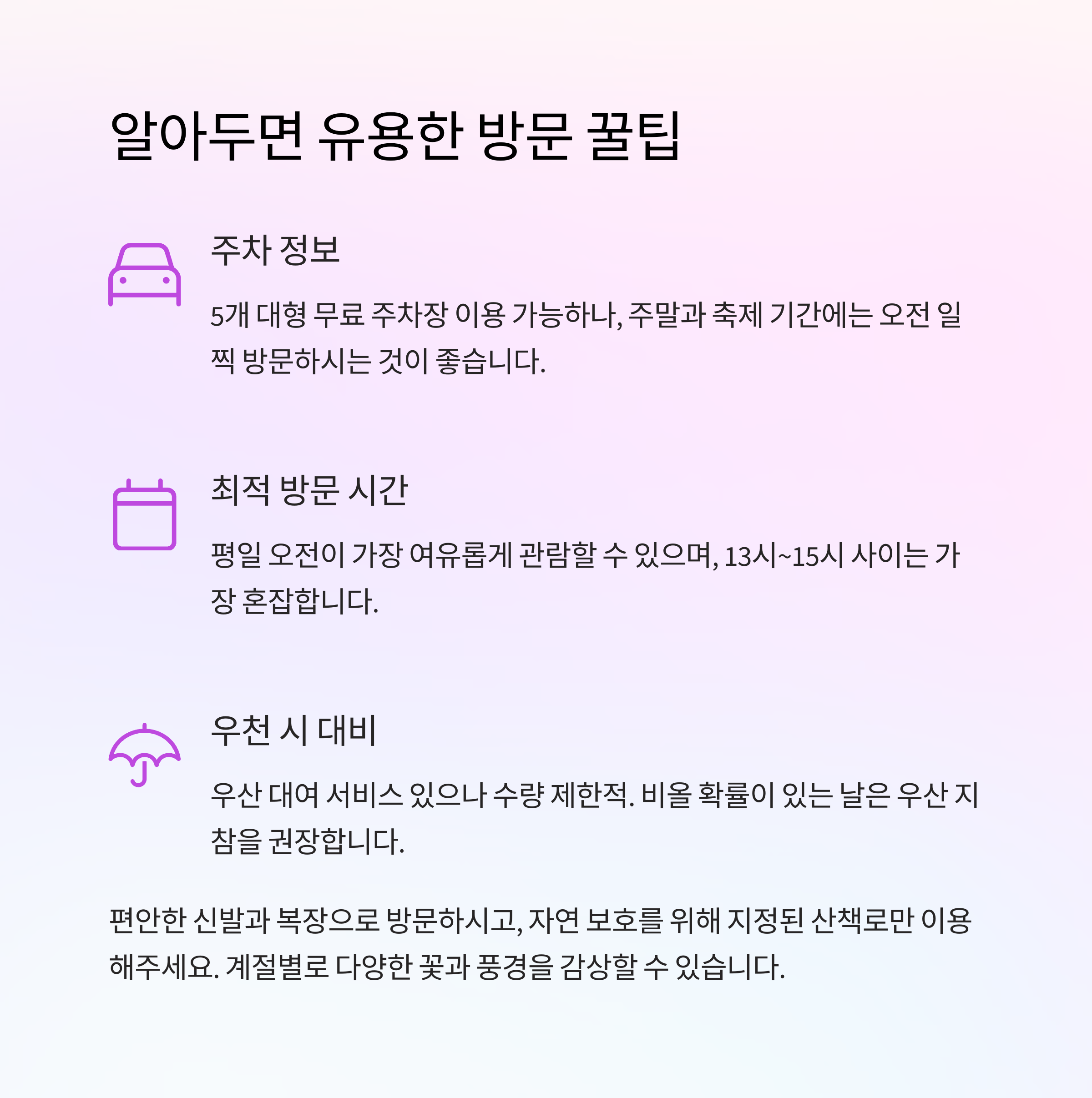 주말에는 주차장 혼잡이 예상되므로 오전 일찍 방문하는 것이 추천됩니다.