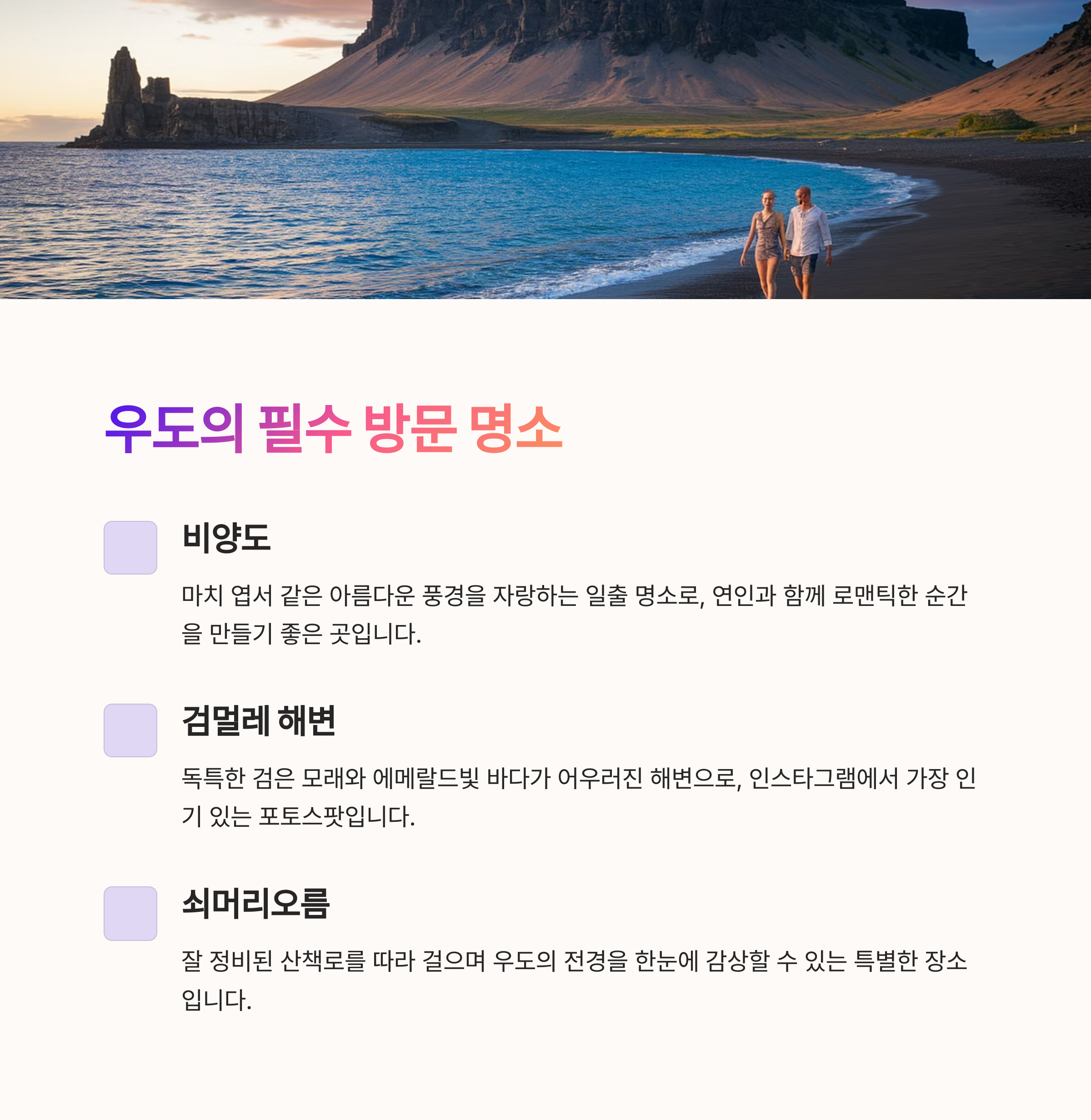 | Q. 우도 여행 준비 시 꼭 챙겨야 할 팁이 있나요? |